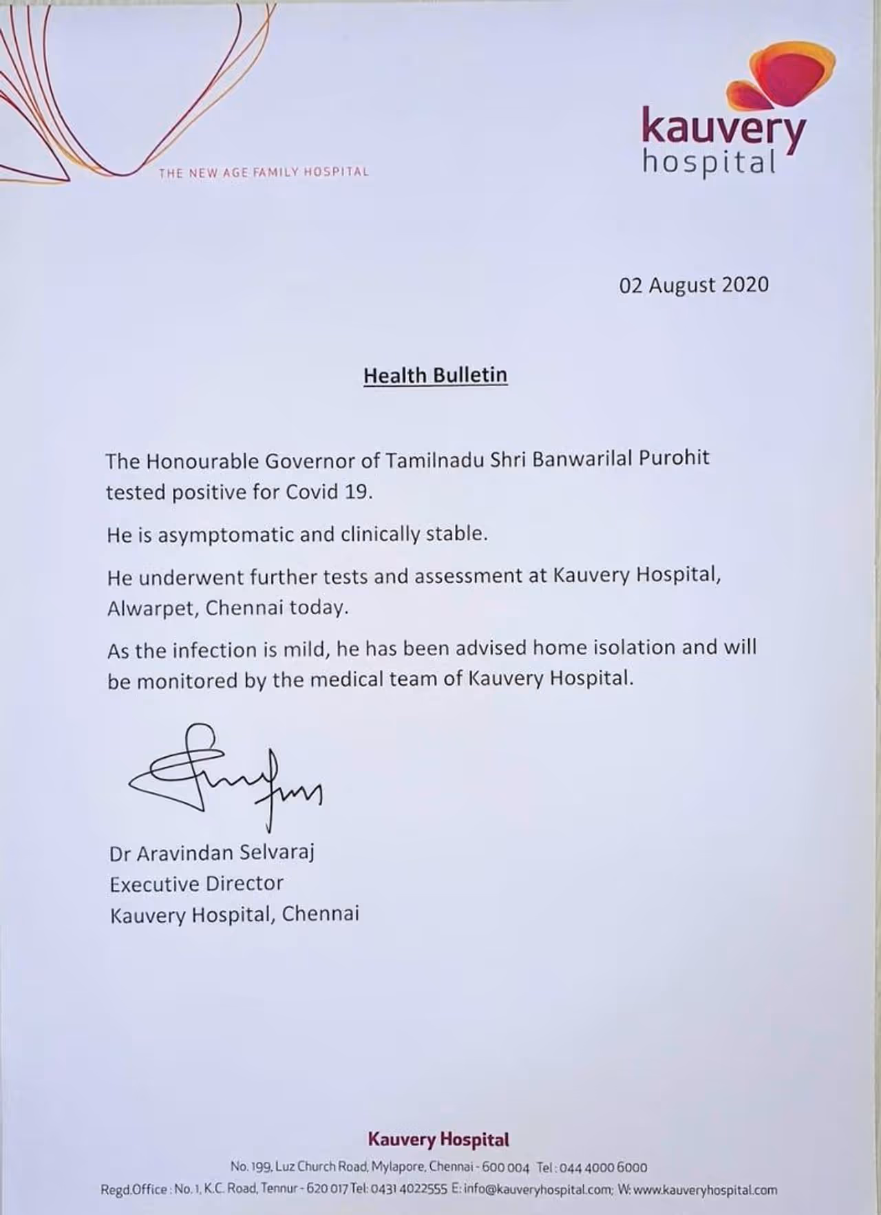 గవర్నర్ కు జూలై 28వ తేదీన వైద్యులు పరీక్షలు నిర్వహించారు. గవర్నర్ పూర్తి ఆరోగ్యంగా, ఫిట్ గా ఉన్నట్టుగా వైద్యులు ప్రకటించారు. సాధారణ పరీక్షల్లో భాగంగానే వైద్యులు గవర్నర్ కు పరీక్షలు చేశారు.వైద్యుల సూచన మేరకు గవర్నర్ స్వీయ నిర్భంధంలోకి వెళ్లారు.