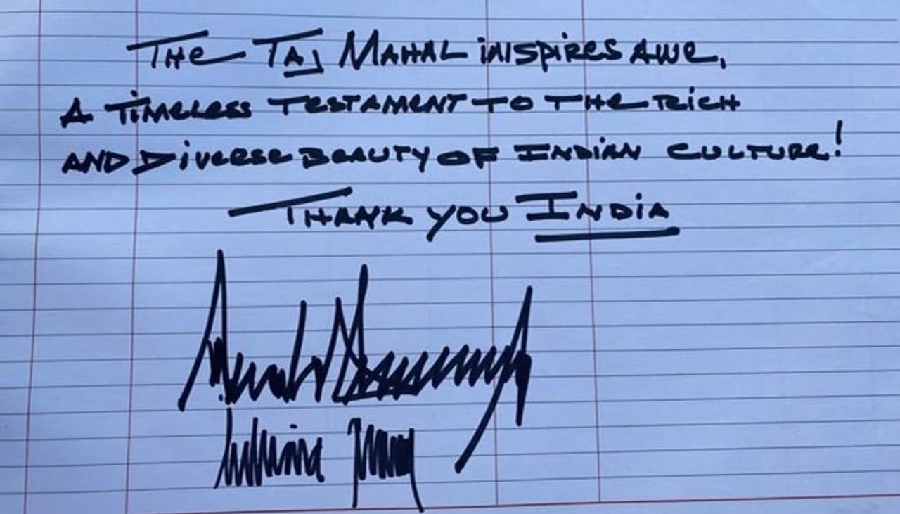 తాజ్ మహల్ అద్భుత స్ఫూర్తి ప్రదాత అని, భారత సంస్కృతిలోని వైవిధ్య సౌందర్యానికి కాలాతీతమైన చిహ్నమని, థాంక్యూ ఇండియా అని విజిటర్స్ బుక్ లో రాశారు. అహ్మదాబాద్ లో రోడ్ షో, సబర్మతీ ఆశ్రమ సందర్శన, నమస్తే ట్రంప్ కార్యక్రమంలో ప్రసంగం వంటి తీరిక లేని కార్యక్రమాల్లో పాల్గొన్న ట్రంప్ దంపతులు తాజ్ మహల్ పై విశేషమైన ఆసక్తిని ప్రదర్శించారు. తాజ్ మహల్ వద్ద ట్రంప్ దంపతులు ఫొటోలు దిగారు.