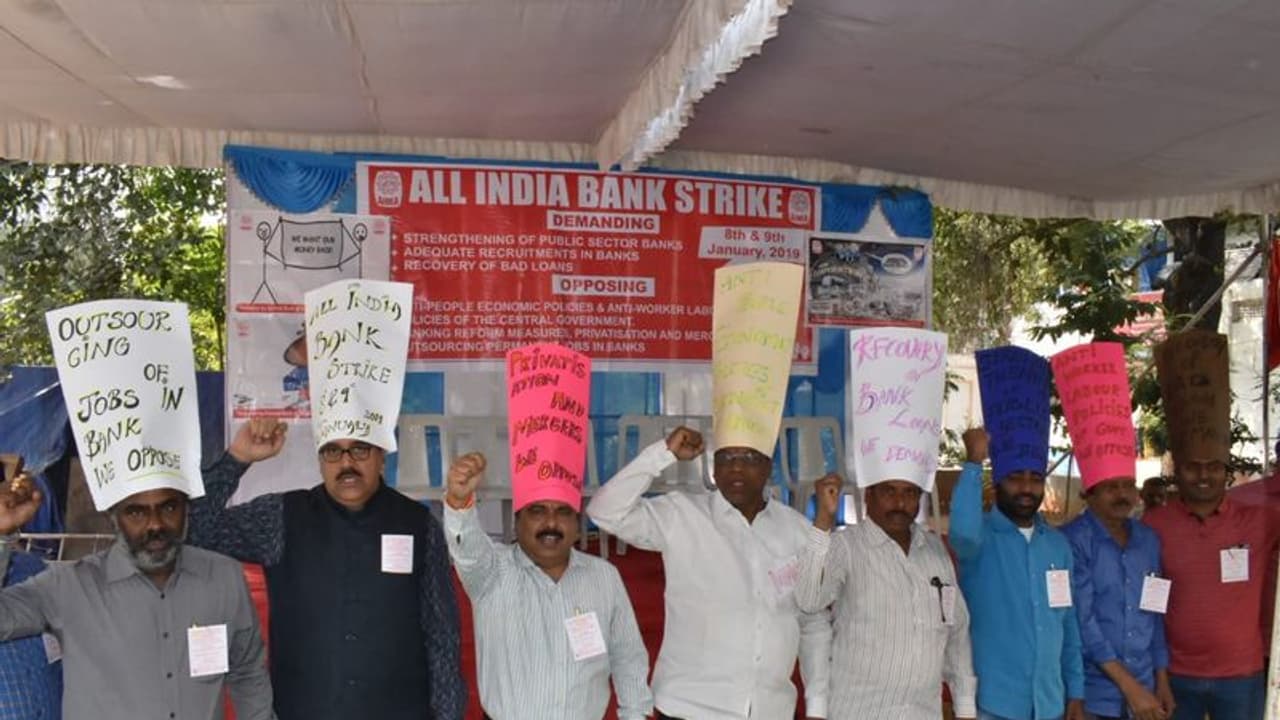 బారత్ బంద్ లో భాగంగా ఇరు తెలుగు రాష్ట్రాల్లో కూడా ప్రభుత్వ రంగ బ్యాంకులు మూతపడ్డాయి. బ్యాంక్ ఉద్యోగులు తమ బ్యాంకుల ముందు టెంట్లు వేసుకుని నిరసన తెలియజేస్తున్నారు. రేపు కూడా( 9వ తేదీ) తాము సమ్మె చేపట్టనున్నట్లు బ్యాంకు ఉద్యోగుల సంఘాలు ప్రకటించాయి. ఈ సమ్మె కారణంగా దేశవ్యాప్తంగా భారీ ఎత్తున లావాదేవీలు నిలిచిపోనున్నాయి.ఈ రెండు రోజుల పాటు ప్రభుత్వ రంగ బ్యాంకుల ఖాతాదారుల లావాదేవీలు నిలిచిపోయి ఇబ్బందులు పడనున్నారు.