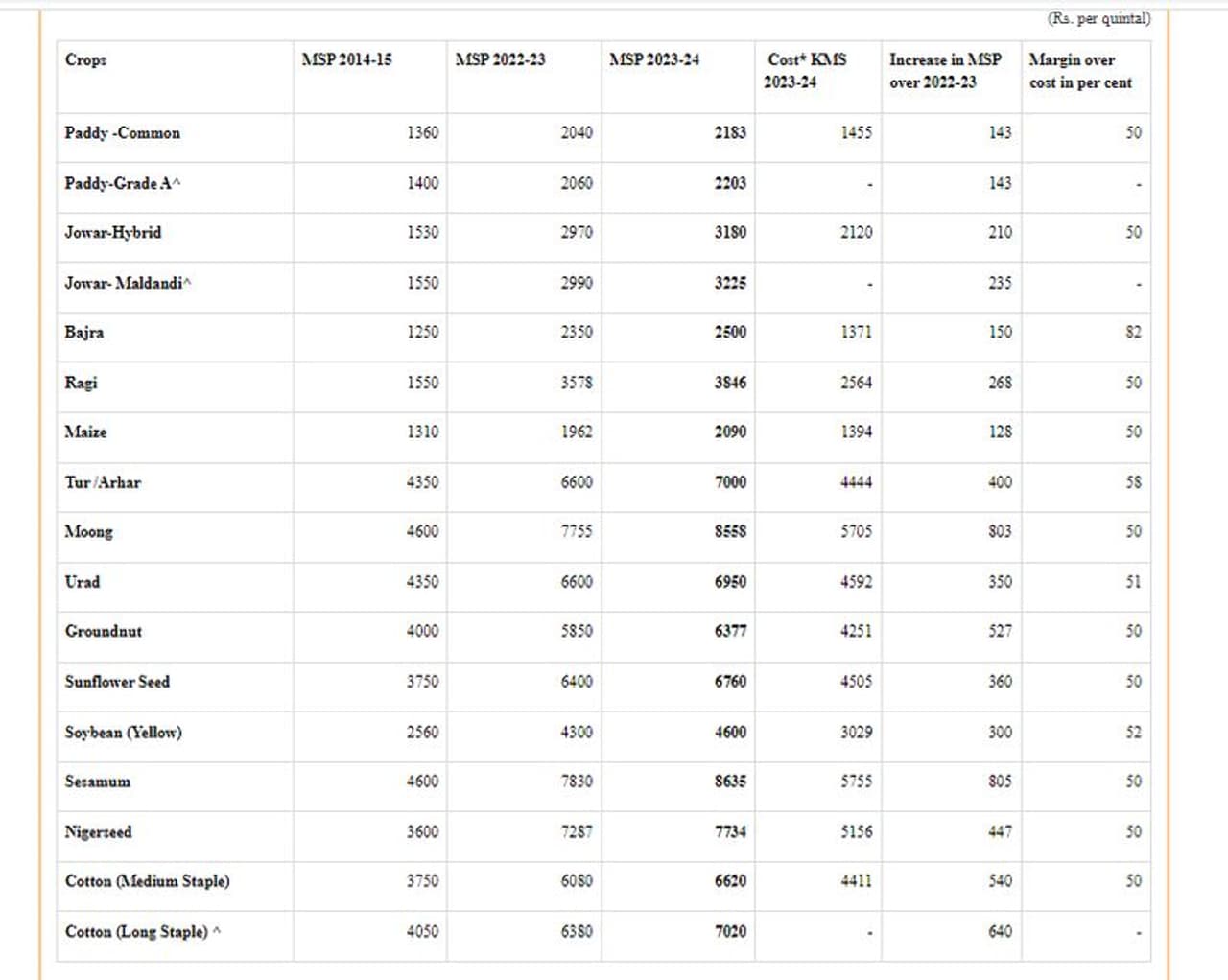 రైతులకు కేంద్ర ప్రభుత్వం గుడ్ న్యూస్ చెప్పింది. 2023-24 ఖరీఫ్ సీజన్కు సంబంధించి పలు పంటలకు కనీస మద్దతు ధర (ఎంఎస్పీ) పెంపునకు కేంద్ర కేబినెట్ ఆమోదం తెలిపింది.
