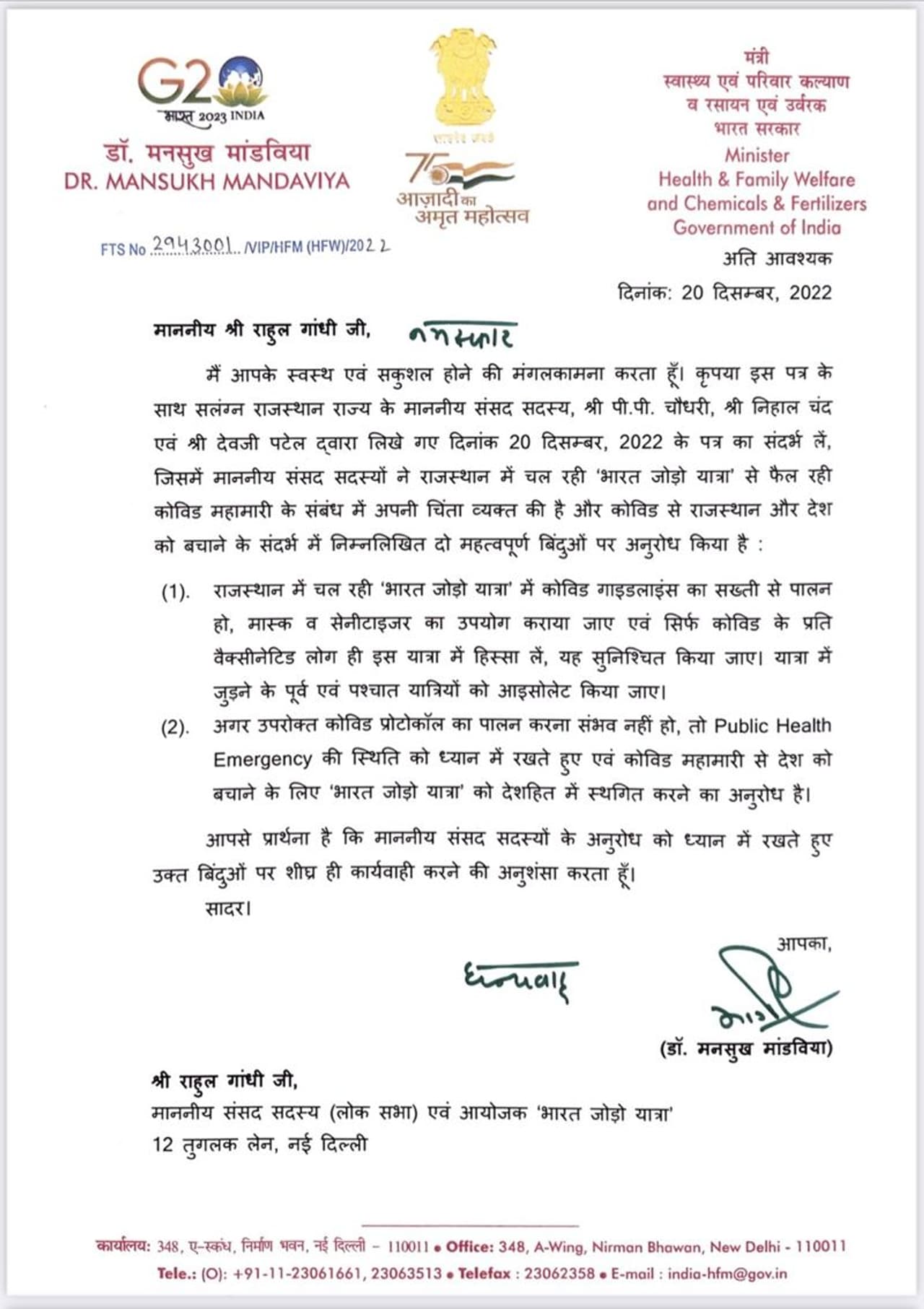 రాజస్థాన్కు చెందిన ముగ్గురు ఎంపీలు పీపీ చౌదరి, నిహాల్ చంద్, దేవ్జీ పటేల్ కరోనా వ్యాప్తిపై లేవనెత్తిన ఆందోళనల దృష్ట్యా.. రాహుల్ గాంధీ భారత్ జోడో యాత్రలో కోవిడ్ మార్గదర్శకాలను కచ్చితంగా పాటించాలని ఈ లేఖలో మంత్రి మన్సుఖ్ మాండవీయా సూచించారు. మాస్క్లు, శానిటైజర్ వినియోగించాలని.. వ్యాక్సిన్ వేసుకున్న వ్యక్తులు మాత్రమే యాత్రలో పాల్గొనేలా చూడాలని స్పష్టం చేశారు. రాజస్థాన్లోని ముగ్గురు ఎంపీలు చేసిన అభ్యర్థనలను దృష్టిలో ఉంచుకుని సత్వర చర్యలు తీసుకోవాలని రాహుల్ గాంధీని, అశోక్ గెహ్లాట్లను కోరారు.