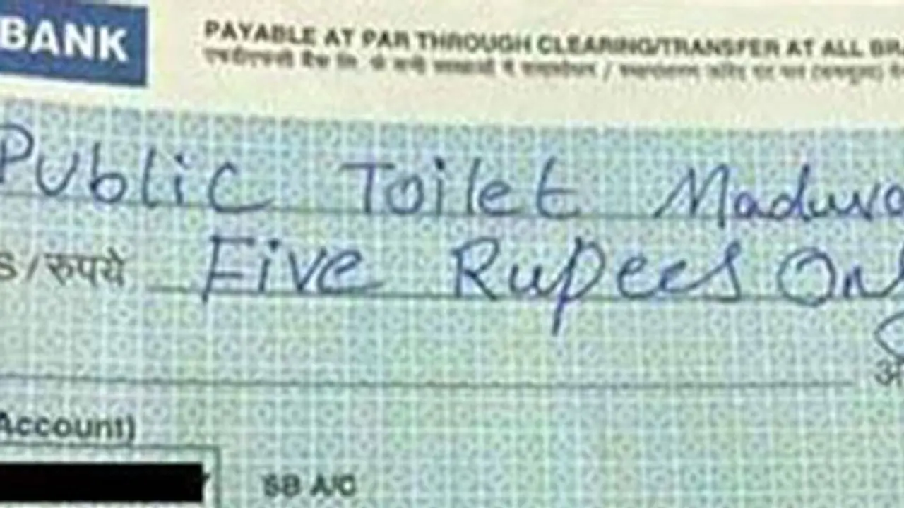 ఓ వ్యక్తి అర్జెంటుగా యూరినల్స్ కు వెళ్లాల్సిన పరిస్థితి... చేతిలో ఉన్న డబ్బు చెల్లడం లేదు. దీంతో మరుగుదొడ్డి వినియోగించుకున్నందుకు ఏకంగా చెక్కు బుక్ నే వినియోగించుకున్నారు.చెల్లించాల్సిన 5 రూపాయిలను చెక్కు రూపంలో రాసిచ్చాడు. హెచ్డీఎఫ్సీ బ్యాంకు పేరుతో ఉన్న ఈ రూ. 5 చెక్కు ఇప్పుడు సోషల్ మీడియాలో చక్కర్లు కొడుతోంది.