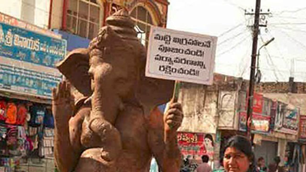 మట్టి విగ్రహాలనే ప్రతిష్టించాలని ప్రచారం, భర్త వినాయకుడిలా వేశం, భార్య రిక్షను తోస్తుంది. కాలుష్యం తగ్గించి భవిషత్తు తరాలను కాపాడాలని ప్రచారం.