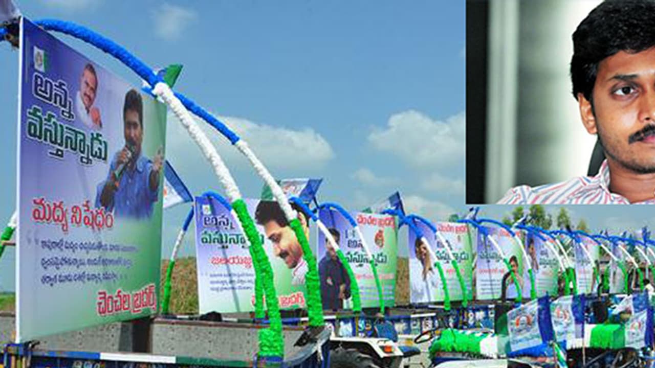 వైసీపీ అధ్యక్షుడు జగన్ సీఎం కావాలని ఆయన అభిమానులు.. ఒక్కోరు ఒక్కో విధంగా అభిమానాన్ని చాటుకుంటున్నారు. ఇప్పటికే ఆ పార్టీకి చెందిన నర్సారావుపేట ఎమ్మెల్యే గోపిరెడ్డి శ్రీనివాస్ రెడ్డి తిరుమలకు పాదయాత్ర చేస్తున్న సంగతి తెలిసిందే. తాజాగా ఓ వ్యక్తి వినూత్నంగా తన వీరాభిమానాన్ని చాటుకున్నాడు. వైసీపీ ప్రకటించిన ‘నవరత్నాలు’ పథకాలను ప్రతిబింబించేలా పోస్టర్లు తయారుచేసి వాటిని ట్రాక్టర్లపై ప్రదర్శించాడు.