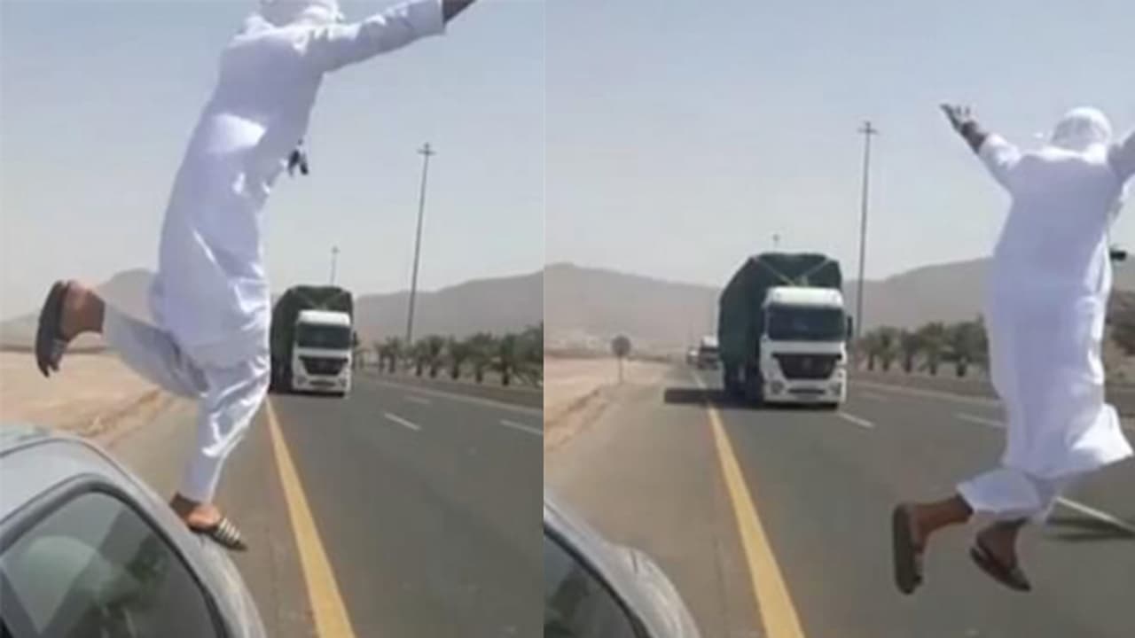 ఓ వ్యక్తిని సౌదీ అరేబియా పోలీసులు అరెస్టు చేశారు. వేగంగా వస్తున్న లారీని చూసిన వ్యక్తి కారు మీద నుంచి దూకి ఒక్కసారిగా ట్రక్కుకు ఎదురువెళ్లాడు.అతి దగ్గరకు వచ్చిన తర్వాత వేగంగా పక్కకు తప్పకున్నాడు. ఇందుకు సంబంధించి రికార్డు చేసిన వీడియోను అతను సోషల్మీడియాలో పోస్టు చేయడంతో అది వైరల్గా మారింది. ఈ వీడియోను వీక్షించిన పోలీసులు అతన్ని అరెస్టు చేశారు. మిగతా ప్రయాణీకుల ప్రాణాలకు ముప్పు తెచ్చేలా ప్రవర్తించినందుకు అతన్ని అరెస్టు చేసినట్లు పేర్కొన్నారు.