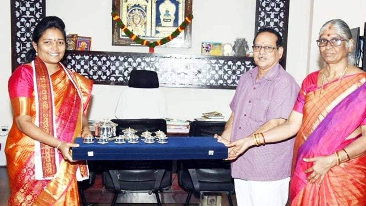 వీటిని ఆలయ కార్యనిర్వహణాధికారి వి.కోటేశ్వరమ్మకు అందజేశారు. ఈ సందర్భంగా సూర్యప్రకాశ్ దంపతులకు అధికారులు అమ్మవారి దర్శనం చేయించి వేదపండితులతో ఆశీర్వాదం ఇప్పించారు. అనంతరం దుర్గమ్మ చిత్రపటం, తీర్థప్రసాదాలు అందజేశారు.