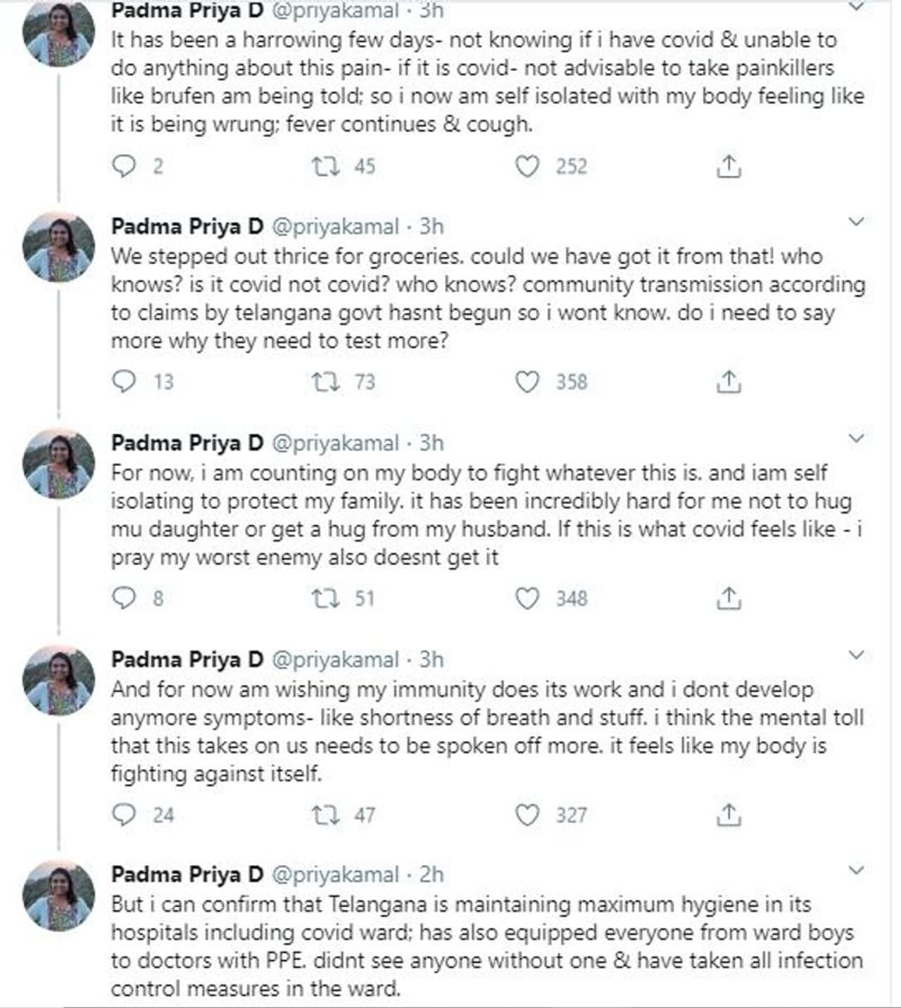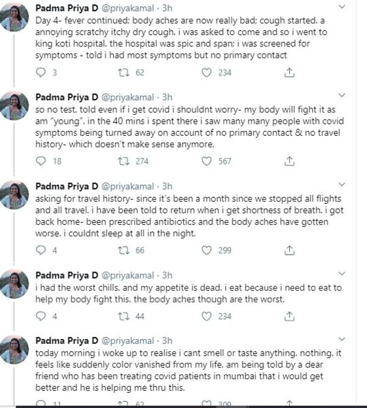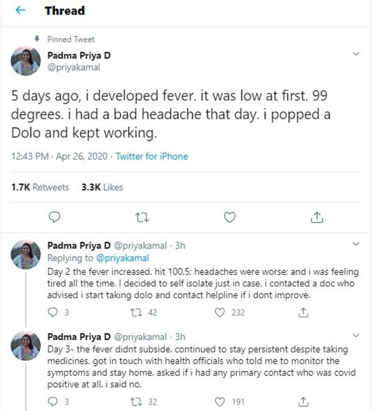 పద్మప్రియ అనే జర్నలిస్ట్ కు 5 రోజుల కింద జ్వరం వచ్చినట్టుగా అనిపించి ఒక పారాసిటమాల్ మాత్ర వేసుకొని తన రోజువారీ పనులకు ఉపక్రమించారు. రెండవరోజు జ్వరం మరింతగా పెరిగి తలనొప్పి కూడా తీవ్రమయినట్టుగా గుర్తించి ఒక డాక్టర్ ని సంప్రదించింది. ఆ సదరు డాక్టర్ సలహా మీద సెల్ఫ్ ఐసొలేషన్ లో ఉంటూ మాత్రలను వాడారు. ఒకవేళ లక్షణాల తీవ్రత అధికమయితే హెల్ప్ లైన్ నెంబర్ కి కాల్ చేయమని డాక్టర్ సలహా ఇచ్చారు.