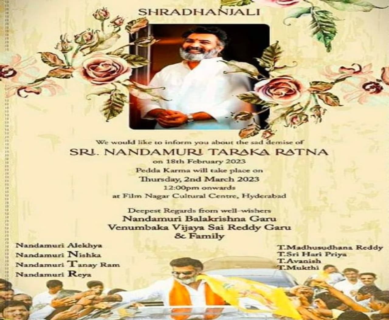 తారకరత్న పెద్దకర్మను మార్చి 2వ తేదీన హైదరాబాద్లోని ఫిల్మ్ నగర్ కల్చరల్ సెంటర్లో నిర్వహించారు. ఇందుకు సంబంధించి బాలకృష్ణ, విజయసాయిరెడ్డిలు మరోసారి కలవనున్నారు. ఇందుకు సంబంధించి ఓ కార్డు కూడా ప్రస్తుం సోషల్ మీడియాలో చక్కర్లు కొడుతుంది. అయితే అందులో తారకరత్న ఫొటో విషయానికి వస్తే.. మెడలో పసువు కండువా, పక్కనే టీడీపీ జెండా ఉండటం ఇప్పుడు మరింత చర్చనీయాంశంగా మారింది. మరి ఈ వ్యవహారాలపై వైసీపీ అధిష్టానం గానీ, విజయసాయిరెడ్డి గానీ ఏ విధంగా స్పందిస్తారనేది వేచి చూడాల్సి ఉంది.