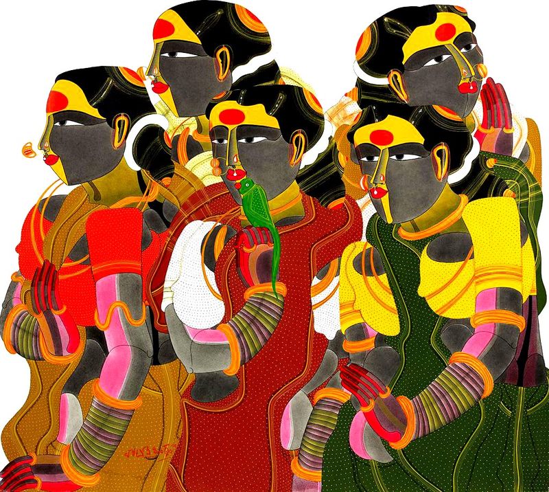 చిత్రమేమిటంటే, అయనసినిమాలకుఆర్ట్ డైరెక్టర్గా పని చేసే రోజుల్లో తన ‘రంగుల కళ’అభవృద్ది ఐనప్పటికీ సరిగ్గా ఆ సమయంలోనే అయన సామాన్యుడిని, లేబర్ ని ఆజానుబాహువుగా చిత్రించారు. మట్టి మనుషులు, వారి ముఖాలు, గాట్లు, పుట్టుమచ్చలు, అన్నీనూ ఎంతో శక్తి కొద్దీ చిత్రాల్లోకి రావడం జరిగింది. ఐతే, తనదైన శైలిని సంతరించుకున్నాక తాను విజయవంతమైన చిత్రకారుడిగా ఎదగడానికి మాత్రం అయనచిత్రాలను ఆక్రమించిన మహిళ పాత్రఅత్యంతముఖ్యమైంది.ఆ మహిళ మువ్వన్నెలతో మెరిసిపోవడం విశేషమే అయింది.