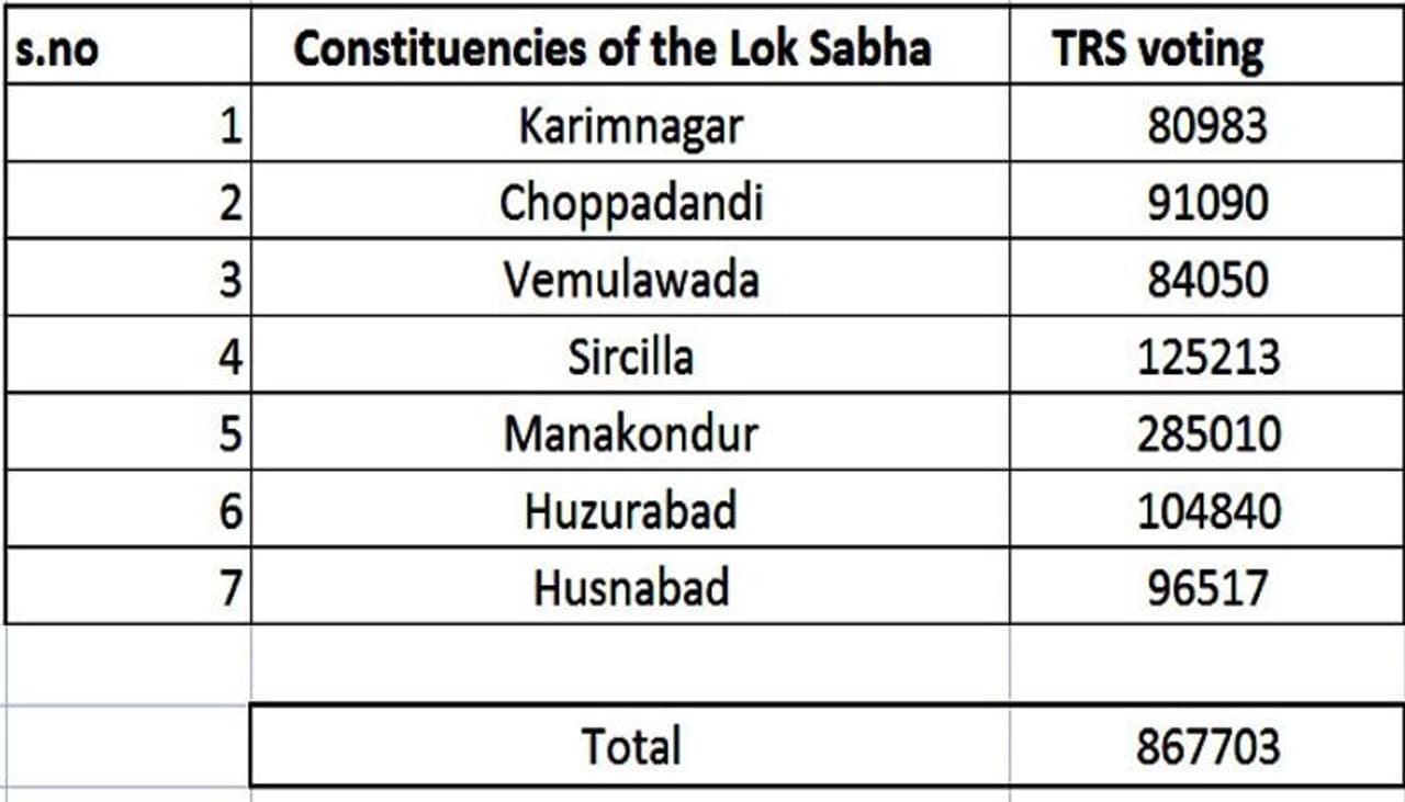 పార్లమెంటు ఎన్నికల్లో తెరాస కు అసెంబ్లీ ఎన్నికలతో పోల్చుకుంటే ఓట్లు గణనీయంగా తగ్గాయి. ఉదాహరణకు కరీంనగర్ పార్లమెంటరీ స్థానాన్ని తీసుకుందాము. అక్కడ ఒక్క బీజేపీ ఎమ్మెల్యే కూడా గెలవలేదు. తెరాస బాస్ కెసిఆర్ కుమారుడు కేటీఆర్ ప్రాతినిధ్యం వహిస్తున్న సిరిసిల్ల నియోజకవర్గం కూడా ఈ పార్లమెంటు స్థానం పరిధిలోకే వస్తుంది. ఇంకో సీనియర్ మంత్రి ఈటెల రాజేందర్ ప్రాతినిధ్యం వహించే హుజురాబాద్ నియోజకవర్గం కూడా ఈ పార్లమెంటు స్థానం పరిధిలోకే వస్తుంది.