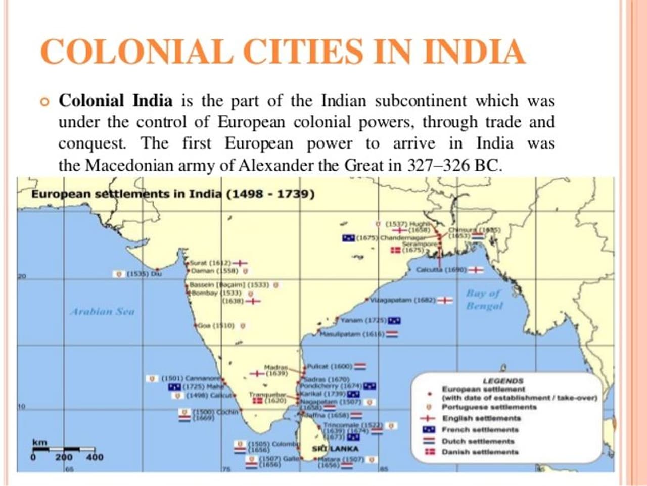 వాణిజ్య దృష్టి నుంచి చూసినప్పుడు సముద్రం పోర్టులు రవాణా అంశాలు ఉన్నప్పటికీ అంతకు మించిన లోతైన అంశాలు వెతికితే కనిపిస్తాయి. మన దేశంలో ఐరోపా స్థావరాలు 1498-1739 నాటికి మొత్తం సముద్ర తీర పట్టణాల్లో వుండటం ఈ క్రింది పటంలో మనం చూడవచ్చు. భూమధ్య రేఖకు దగ్గరగా ఉండే దేశాల్లో ఉష్ణతాపం యూరోపియన్లకు భరింపశక్యం కాకుండేది, దాంతో ఏడాది పొడుగునా మిగతా పట్టణాలు కంటే ఉష్ణోగ్రతలు తక్కువగా ఉండే సముద్రతీర పట్టణాలు పరిపాలనా కేంద్రాలు అయ్యాయి.