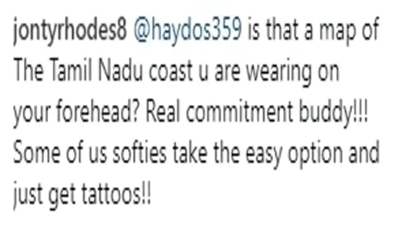 హెడెన్ తలపై వున్న గాయం అచ్చం తమిళనాడు మ్యాప్ ను పోలి ఉందంటూ జాంటీ రోడ్స్ తెలిపాడు. హెడెన్ పోటోపై రోడ్స్ ఇలా స్పందించాడు. ''హెడెన్... తలపై తమిళనాడు మ్యాప్ ను వేసుకున్నావా? తమిళనాడు పై నీకున్న నిబద్దతకు ఇది నిదర్శనం...నిన్ను అనుసరించి చాలా మంది ఇక తమిళనాడు మ్యాప్ టాటూలు వేసుకునే అవకాశం ఉంది'' అంటూ కామెంట్ చేశాడు.