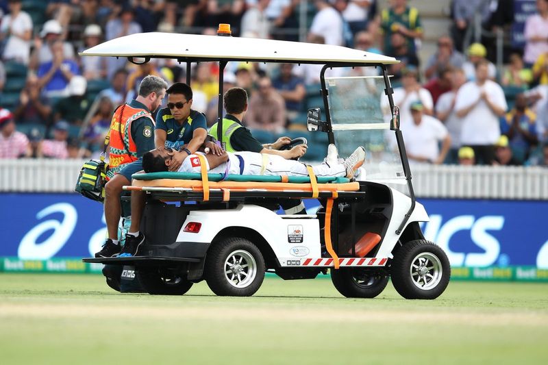 దీంతో అతన్ని రిటైర్హార్ట్ గా ప్రకటించి స్ట్రెచర్ పై మైదానం బయటకు తీసువచ్చి జట్టు ఫిజియో ప్రథమ చికిత్స అందించాడు. అయినా నొప్పి ఎక్కువగా వుండటంతో ఆస్పత్రికి తరలించారు. అత్యంత వేగంగా వచ్చిన బంతి తగలడం వల్ల మెడ బాగంలో తీవ్ర గాయమవడంతో పాటు చేతి నరాలు కూడా స్వల్పంగా దెబ్బతిన్నట్లు డాక్టర్లు తెలిపారు. అయితే ప్రస్తుతం అతడికి చికిత్స అందిస్తున్నామని...ఆరోగ్య పరిస్థితి మెరుగ్గానే వున్నట్లు డాక్టర్లు తెలిపారు.