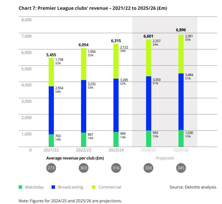 ప్రీమియర్ లీగ్ వాణిజ్య ఆదాయం 2024/25లో 2.3 బిలియన్ పౌండ్లకు చేరుకుంటుందని అంచనా. 2026/27లో జూదం భాగస్వామి నిషేధం అమలులోకి రాకముందు క్లబ్లు షర్ట్ స్పాన్సర్షిప్ అవకాశాలను ఉపయోగించుకోవడం వల్ల 2025/26లో వృద్ధి ఉంటుందని అంచనా.