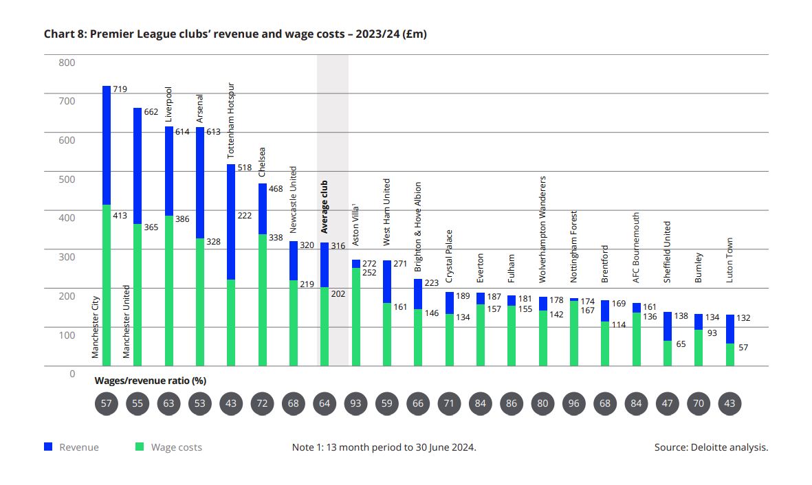 నాటింగ్హామ్ ఫారెస్ట్, ఆస్టన్ విల్లా వేతన/ఆదాయ నిష్పత్తులు 90% కంటే ఎక్కువగా ఉన్నాయి. ఇది స్థిరంగా లేదని డెలాయిట్ పేర్కొంది. లీడ్స్, లీసెస్టర్, సౌతాంప్టన్ బహిష్కరణ కారణంగా కొత్తగా ప్రమోట్ చేయబడిన జట్లలో 440 మిలియన్ పౌండ్ల వేతన బిల్లు 215 మిలియన్ పౌండ్లతో భర్తీ అయింది.