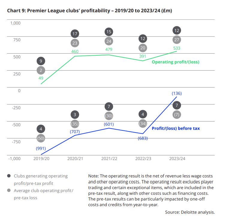 ప్రీమియర్ లీగ్ క్లబ్లు 2018/19 నుండి అత్యధిక ఆపరేటింగ్ లాభం (0.5 బిలియన్ పౌండ్లు) సాధించాయి. ఇది సంవత్సరానికి 36% పెరుగుదల. పన్నుకు ముందు నష్టాలు 2022/23లో 0.7 బిలియన్ పౌండ్ల నుండి 0.1 బిలియన్ పౌండ్లకు గణనీయంగా తగ్గాయి.