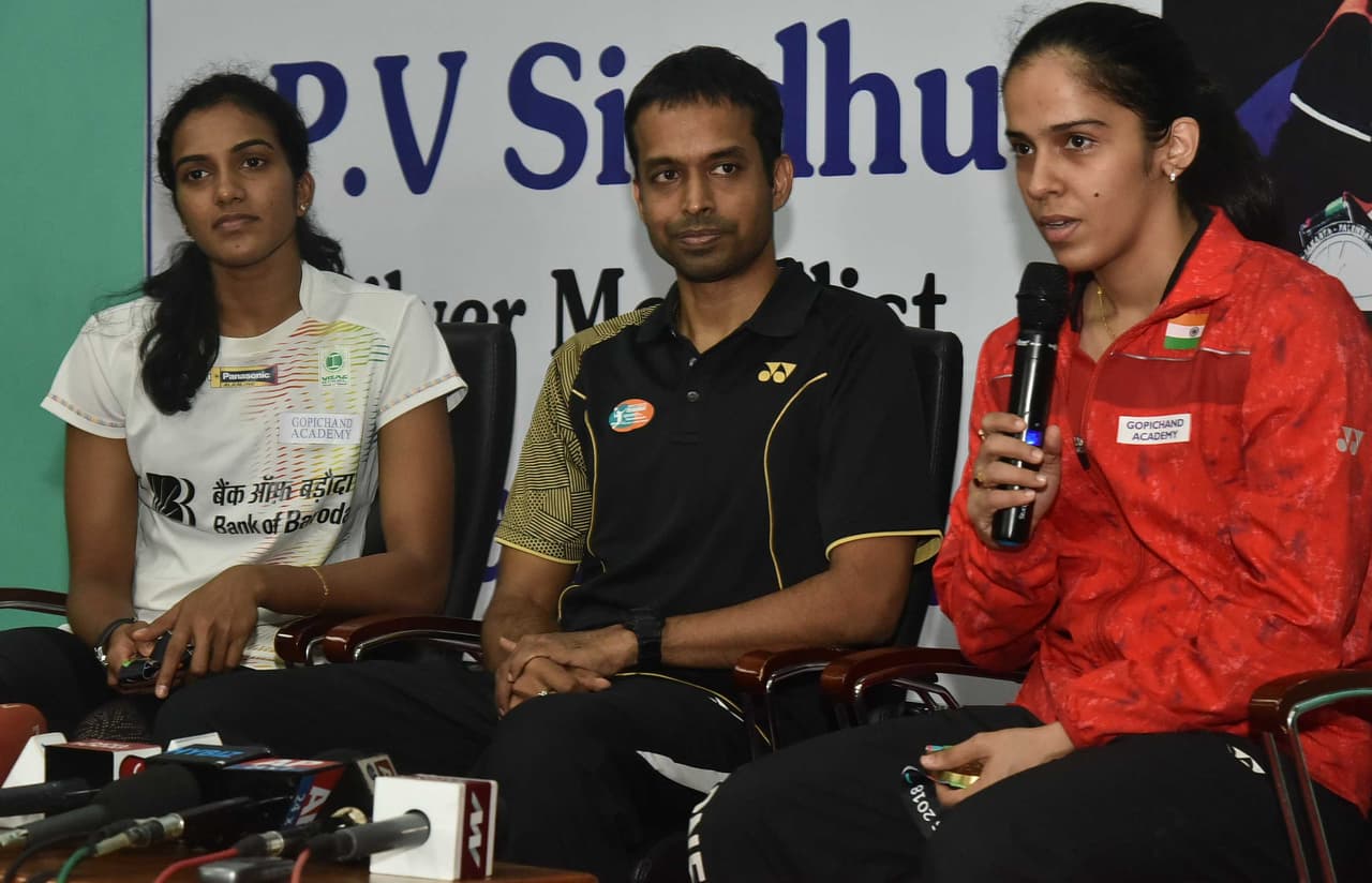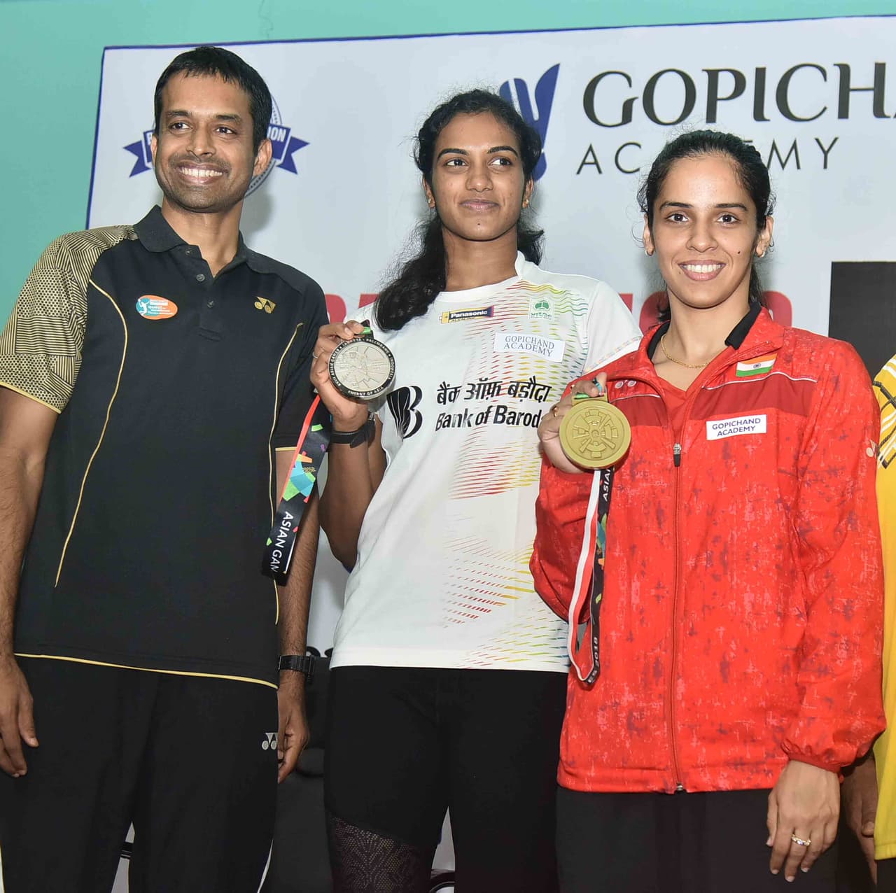 ఆసియా క్రీడల బ్యాడ్మింటన్ విభాగంలో పతకాలు సాధించి ఇండియాకు తిరిగివచ్చిన సైనా, సింధు లు గచ్చిబౌలి లోని పుల్లెల గోపిచంద్ అకాడమీలో విలేకరులతో మాట్లాడారు. ఈ ప్రెస్ మీట్ లో వీరిద్దరితో పాటు బ్యాడ్మింటన్ కోచ్ పెల్లెల గోపిచంద్ కూడా పాల్గొన్నారు.