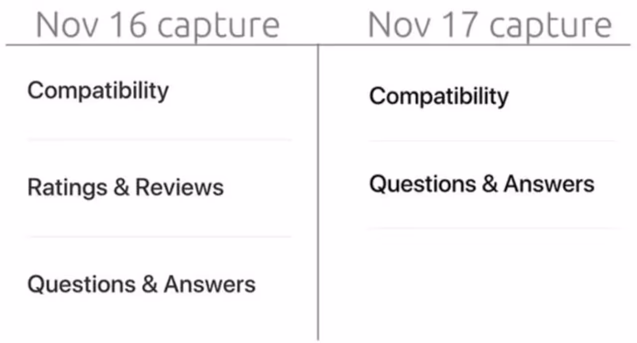ఆన్లైన్ ఆర్చివ్స్ సోర్స్ వేబ్యాక్ మెషిన్ కాష్ డేటా ప్రకారం కొత్త అప్ డేట్ గత వారం జరిగినట్లు కనిపిస్తోంది. నవంబర్ 17 నుండి రేటింగ్స్ & రివ్యూస్ విభాగాన్ని తెసేసినట్టు చూపిస్తుంది.16 అంగుళాల మాక్బుక్ ప్రోను ప్రారంభించిన కొద్ది సేపటికే ఆపిల్ ఈ విభాగాన్ని తొలగించి ఉండవచ్చు. అయితే ఈ చర్య కావాలని తీసేసారా లేక ఇంకేదైనా జరిగిందా అనేది అస్పష్టంగా ఉంది. యాపిల్ సంస్థ గతంలో మాక్బుక్ ప్రో మోడళ్లలో కొన్ని ముఖ్యమైన సమస్యలను ఎదుర్కొంది.