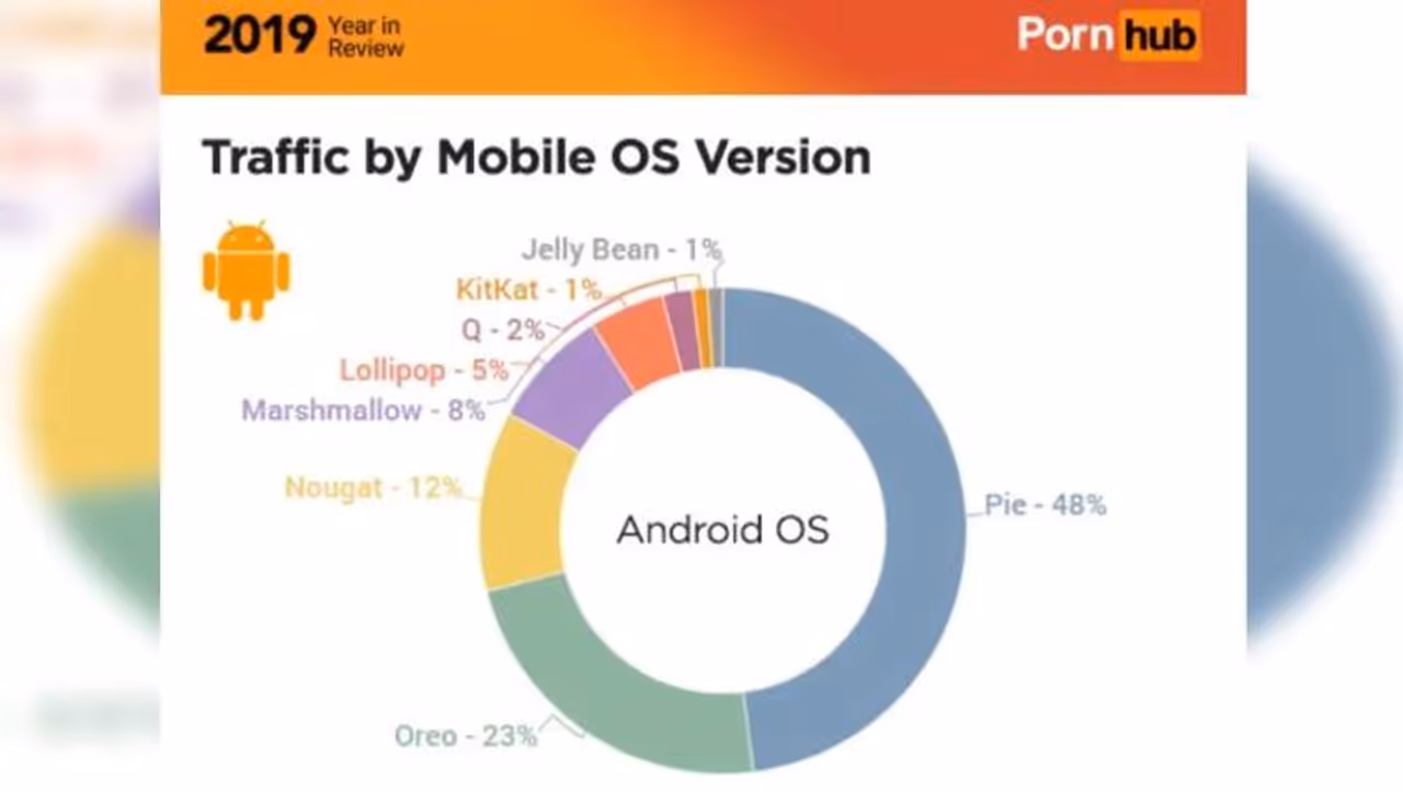 2019 లో పోర్న్హబ్ వెబ్సైట్లో ఆండ్రాయిడ్ ట్రాఫిక్లో 48 శాతం పైగా (గత సంవత్సరం గూగుల్ నుండి వచ్చిన ప్రధాన అప్ డేట్), ఓరియో (2017 అప్ డేట్) నుండి 23 శాతం, నౌగాట్ (2016 అప్ డేట్) నుండి 12 శాతం వచ్చాయి.కొత్తగా విడుదలైన ఆండ్రాయిడ్ 10 (క్యూ) పోర్న్హబ్ అడల్ట్ ఎంటర్టైన్మెంట్ సైట్ 2019 సంవత్సరంలో 2 శాతం ట్రాఫిక్ను సూచిస్తుంది, ఈ డేటాను ఓ పత్రిక నివేదించింది.