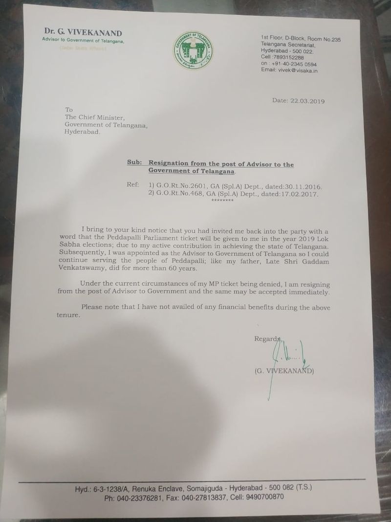 తెలంగాణ రాష్ట్రప్రభుత్వ సలహాదారు పదవికి రాజీనామా చేశారు. తన రాజీనామా లేఖను సీఎం కేసీఆర్ కు పంపిచారు వివేక్. 2019 ఎన్నికల్లో పెద్దపల్లి లోక్ సభ టికెట్ ఆశించి భంగడపడ్డారు మాజీఎంపీ వివేక్. గతంలో 2019 ఎన్నికల్లో పెద్దపల్లి లోక్ సభ టికెట్ ఇస్తానని హామీ ఇచ్చారని లేఖలో పేర్కొన్నారు.