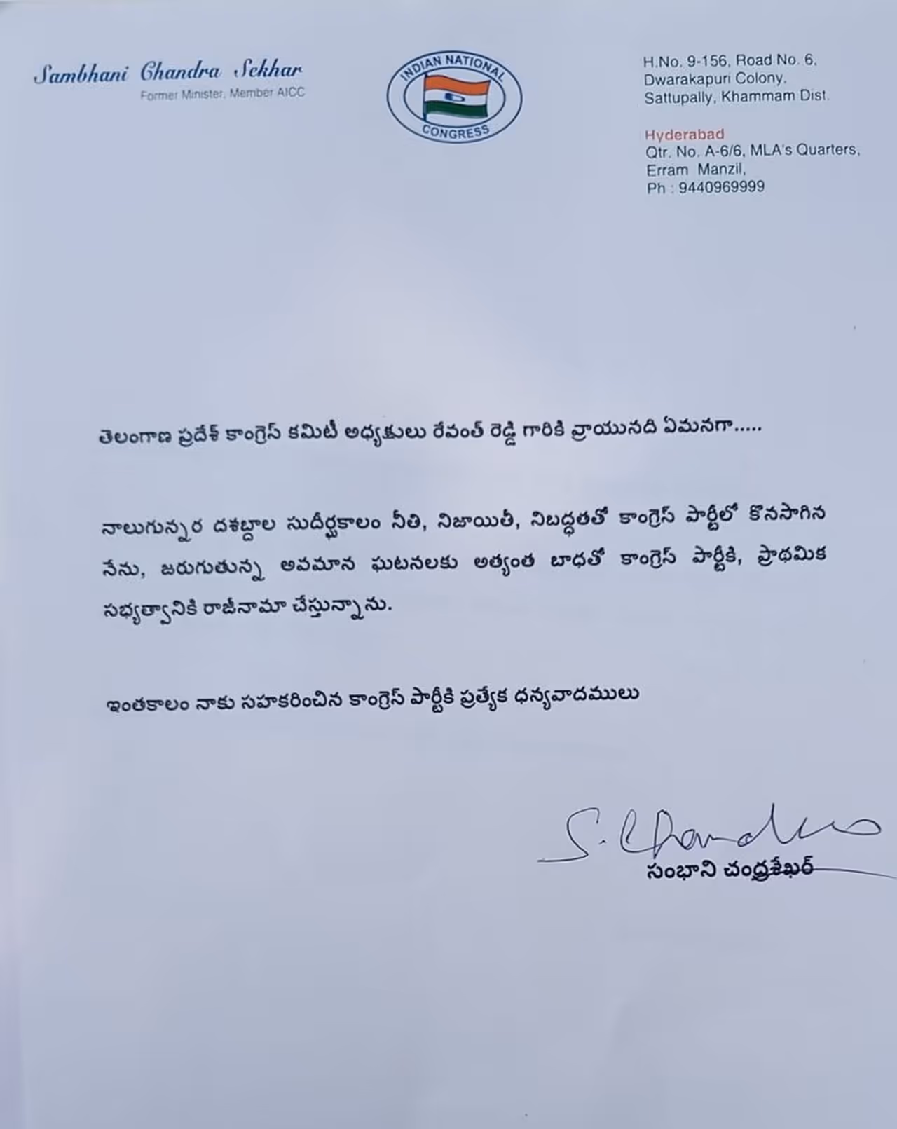 హైదరాబాద్: మాజీ మంత్రి సంభాని చంద్రశేఖర్ కాంగ్రెస్ కు రాజీనామా చేశారు.ఉమ్మడి ఖమ్మం జిల్లాలోని సత్తుపల్లి అసెంబ్లీ స్థానం నుండి కాంగ్రెస్ టిక్కెట్టును సంభాని చంద్రశేఖర్ ఆశించారు. కానీ పార్టీ నాయకత్వం సంభాని చంద్రశేఖర్ కు టిక్కెట్టు కేటాయించలేదు. దీంతో ఆయన కాంగ్రెస్ పార్టీ ప్రాథమిక సభ్యత్వానికి రాజీనామా చేశారు.పార్టీలో తనను అవమానించారని ఆ లేఖలో సంభాని చంద్రశేఖర్ పేర్కొన్నారు. వరుస అవమానాలతో బాధపడ్డానని సంభాని చంద్రశేఖర్ చెప్పారు.