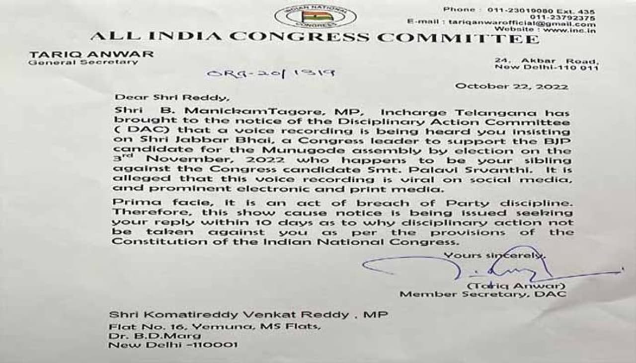 మునుగోడులో కాంగ్రెస్ పార్టీ గెలవదని వ్యాఖ్యలు చేసిన భువనగిరి ఎంపీ కోమటిరెడ్డి వెంకట్ రెడ్డిపై పార్టీ నోటీసులు పంపింది. 10 రోజుల్లో వివరణ ఇవ్వాలని ఆదేశించింది.