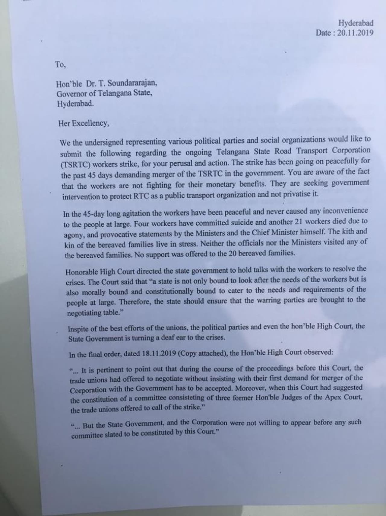 ఆర్టీసీ సమ్మె నేపథ్యంలో అఖిలపక్ష నేతలు బుధవారం తెలంగాణ గవర్నర్ తమిళిసైని కలిసి వినతిపత్రం సమర్పించారు.