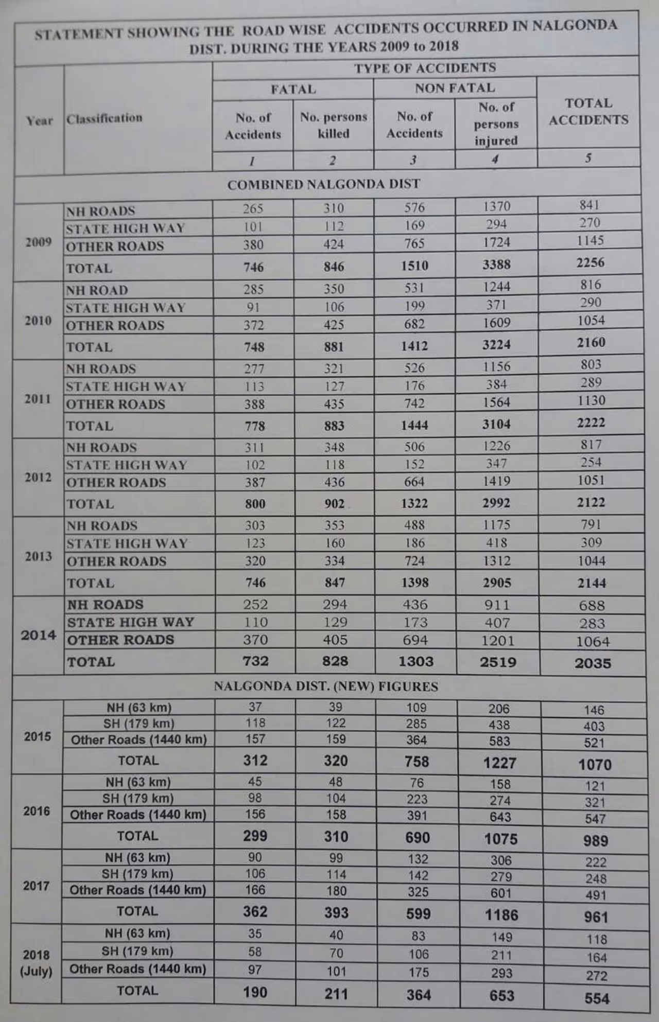 2009లో జాతీయ, రాష్ట్ర రహదారులపై 2256 ప్రమాదాలు జరిగాయి.846 మంది మరణించారు. 3388 మంది గాయపడ్డారు. ఇక 2010లో 2160 రోడ్డు ప్రమాదాలు చోటు చేసుకొన్నాయి.881 మంది చనిపోతే , 3234 మంది తీవ్రంగా గాయపడ్డారు. 2011 లో2222 రోడ్డు ప్రమాదాలు చోటు చేసుకొన్నాయి. ఇందులో 883 మంది మృత్యువాతపడ్డారు. మరో 3104 మంది తీవ్రంగా గాయపడ్డారు.2012లో 2122 రోడ్డు ప్రమాదాలు చోటు చేసుకొన్నాయి.902 మంది మృతి చెందగా, 2992 మంది గాయపడ్డారు.