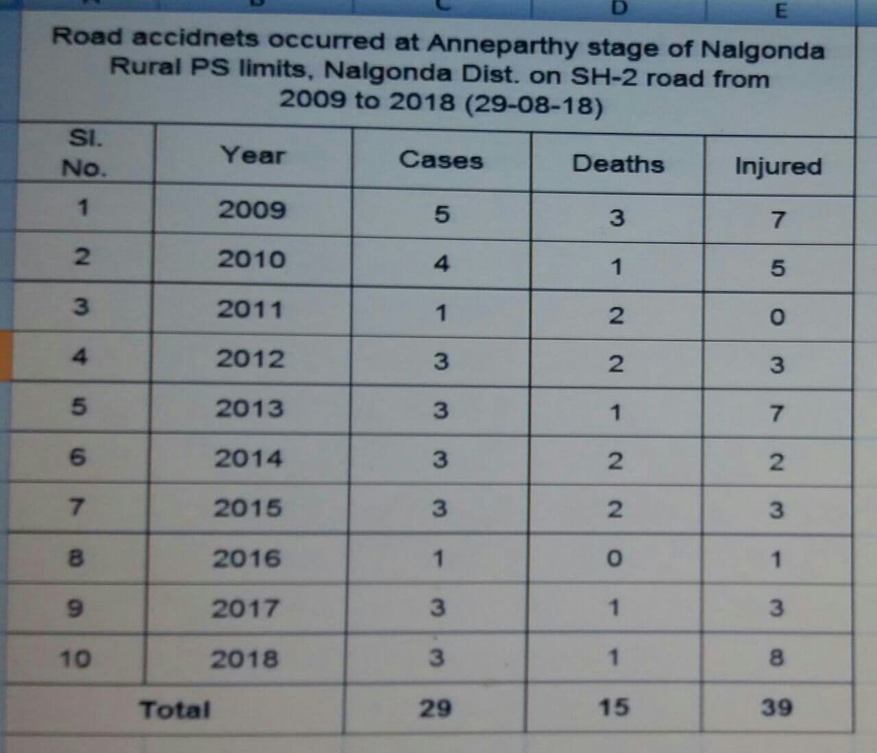 2017లో 961 ప్రమాదాలు జరిగితే 393 మంది చనిపోయారు, 1186 మంది గాయపడ్డారు.ఈ ఏడాది ఇప్పటివరకు 554 రోడ్డు ప్రమాదాలు చోటు చేసుకొన్నాయి. ఇందులో 211 మంది చనిపోతే 653 మంది గాయపడ్డారు.