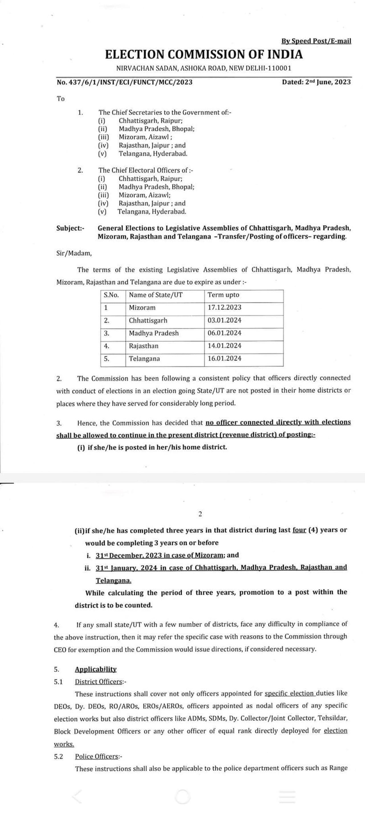 ఢిల్లీ : ఐదురాష్ట్రాలలో ప్రస్తుత శాసన సభల గడువు వచ్చే ఏడాది ముగియనున్న నేపథ్యంలో కేంద్ర ఎన్నికల సంఘం... ఆ తేదీలను విడుదల చేస్తూ ఎన్నికల ఎన్నికల ప్రక్రియపై దృష్టి సారించింది. ఎన్నికల అధికారుల పోస్టింగ్ లపై ఆయా రాష్ట్రాల సీఎస్, సీఈఓలకు భారత ఎన్నికల కమీషన్ మార్గదర్శకాలు జారీచేసింది.