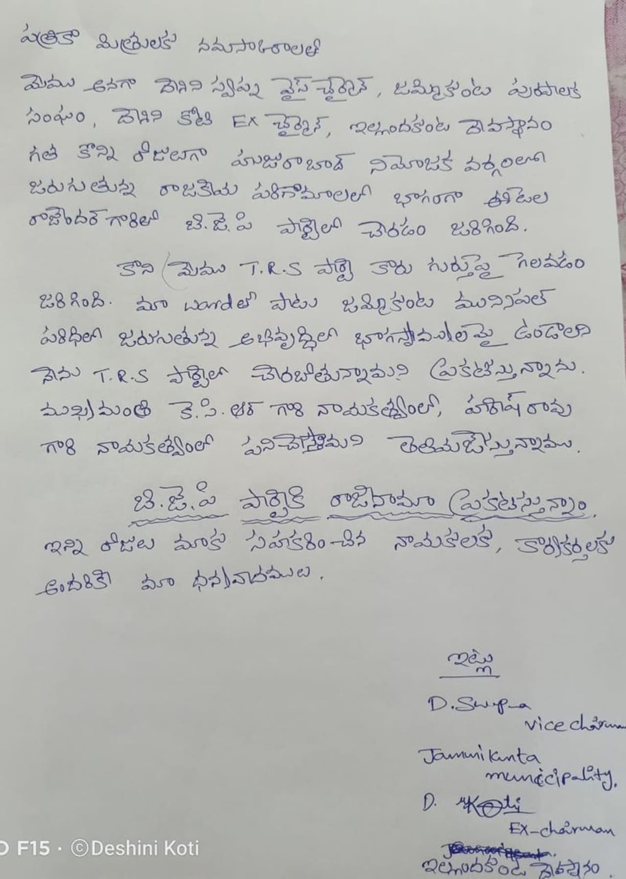 హుజురాబాద్ లో ఇటీవల చోటుచేసుకున్న రాజకీయ పరిణామాల నేపథ్యంలో తాము మాజీ మంత్రి ఈటల రాజేందర్ వెంట నడిచినట్లు దేశిని దంపతులు తెలిపారు. ఇలా బిజెపి పార్టీలో చేరినప్పటికి గెలిచింది మాత్రం టీఆర్ఎస్ కారు గుర్తుపైనే అని అన్నారు. కాబట్టి మా వార్డులో జరుగుతున్న అభివృద్ధిలో భాగస్వామ్యం కావాలనే తిరిగి టీఆర్ఎస్ పార్టీలో చేరుతున్నామన్నారు. ఇకపై సీఎం కేసీఆర్, మంత్రి హరీష్ రావు నాయకత్వంలో పనిచేస్తామంటూ రాజీనామా లేఖలో పేర్కొన్నారు దేశిని స్వప్న, కోటి దంపతులు.