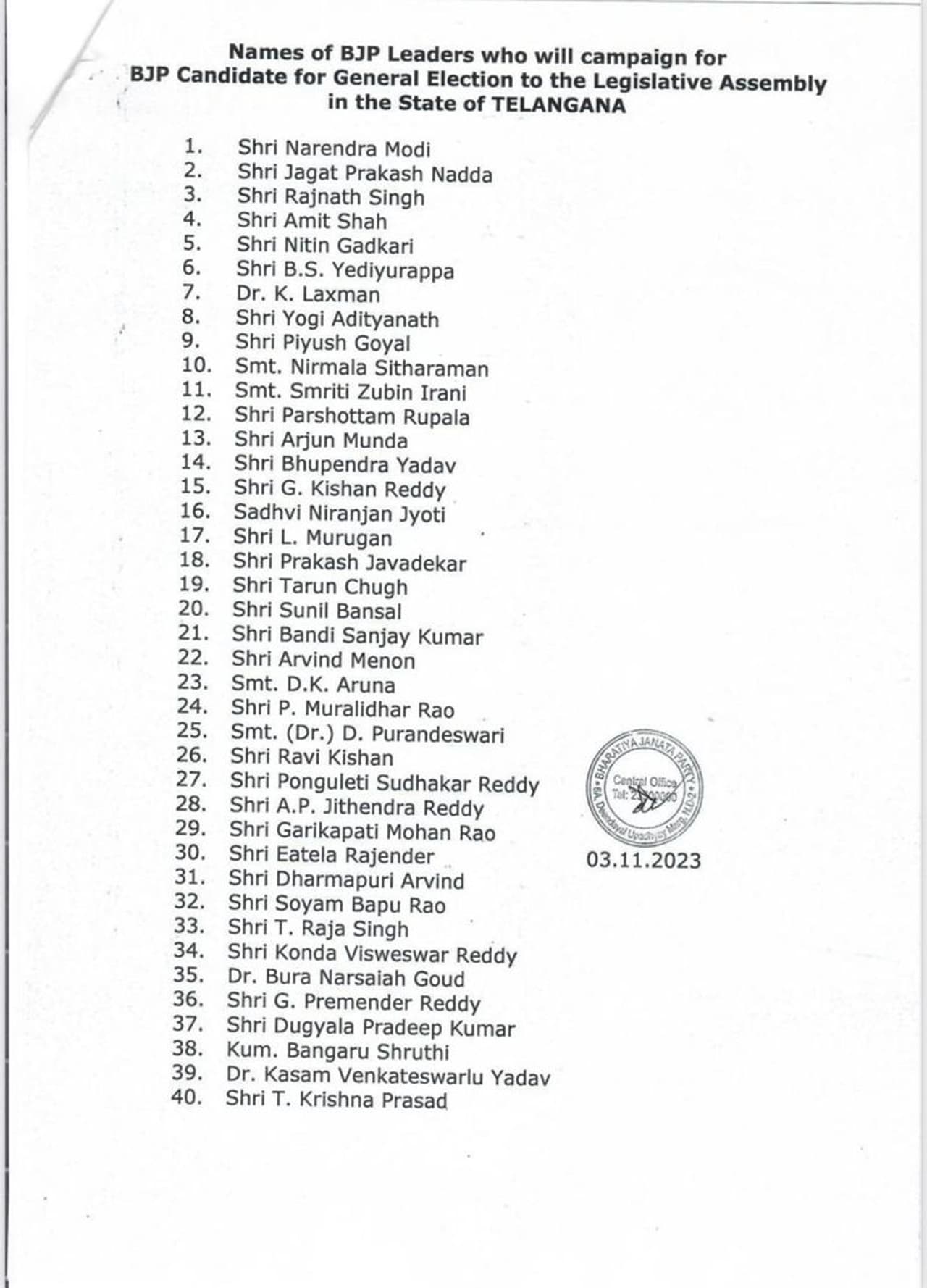 తెలంగాణలో ప్రచారం చేపట్టే నాయకుల లిస్ట్ :
