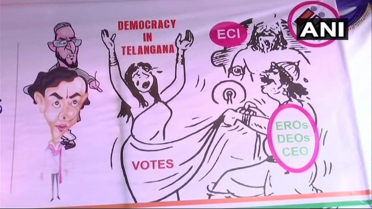 తెలంగాణలో ఎన్నికలను అపహాస్యం చేసే విధంగా ఎన్నికల కమిషన్ వ్యవహరించిందని ఆరోపిస్తూ కాంగ్రెస్ పార్టీ గురువారం నాడు కార్టూన్ను విడుదల చేసిందిమహాభారతంలో ద్రౌపది వస్త్రాపహరణాన్ని పోలి ఉన్న కార్టూన్ను విడుదల చేశారు. ద్రౌపది రూపంలో ఉన్న వారిని తెలంగాణలో ఉన్న ఓటర్లుగా, వస్త్రాపహరణం చేస్తున్నవారిని ఎన్నికల అధికారులుగా చూపారు.