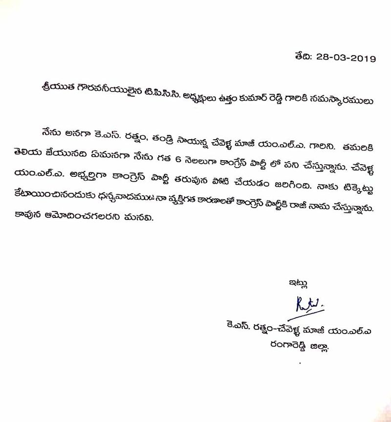 ఈ సందర్భంగా రత్నం టిపిసిసి అధ్యక్షులు ఉత్తమ్ కుమారక్ రెడ్డికి ఓ లేఖ రాశారు. గత ఆరు నెలల క్రితమే కాంగ్రెస్ లో చేరిన తనకు గత అసెంబ్లీ ఎన్నికల సమయంలో చేవెళ్ల టికెట్ ఇచ్చి పోటీ చేసే అవకాశమిచ్చినందుకు ఉత్తమ్ కు ధన్యవాదాలు తెలిపారు. అయితే వ్యక్తిగత కారణాలతోనే కాంగ్రెస్ కు రాజీనామా చేస్తున్నానని...కావున ఆమోదించాల్సిందిగా రత్నం ఉత్తమ్ ను కోరారు.