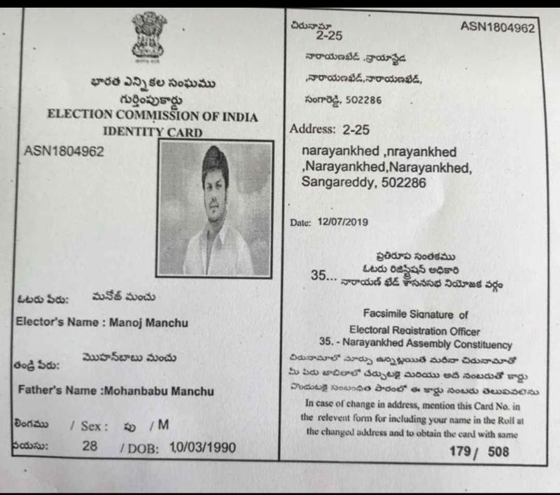 ఉమ్మడి మెదక్ జిల్లాలోని నారాయణఖేడ్ మున్సిపాటిలీ పరిధిలో సినీ నటుడు మంచు మనోజ్ పేరుతో ఓటు హక్కునమోదైంది.