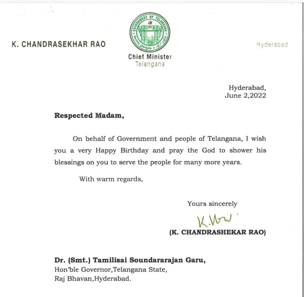 తెలంగాణ గవర్నర్ తమిళిసై సౌందర్రాజన్, సీఎం కేసీఆర్ల (kcr) మధ్య గత కొన్నినెలలుగా గ్యాప్ పెరిగిన సంగతి తెలిసిందే. దీనిపై స్వయంగా గవర్నర్ తమిళిసై కూడా స్పందించారు. అయినప్పటికీ ప్రగతి భవన్ నుంచి ఎలాంటి సానుకూల స్పందన కనిపించలేదు. ఈ నేపథ్యంలో తమిళిసై సౌందరరాజన్ పుట్టిన రోజు (Tamilisai Soundararajan Birthday) సందర్భంగా ఆసక్తికర ఘటన చోటు చేసుకుంది. తమిళిసైకి ముఖ్యమంత్రి కే చంద్రశేఖర్ రావు శుభాకాంక్షలు తెలిపారు. ఈ మేరకు సీఎం లేఖ పంపారు. ‘‘తెలంగాణ ప్రభుత్వం, ప్రజల తరపున మీకు జన్మదిన శుభాకాంక్షలు.. దేవుడి ఆశీస్సులతో మీరు మరిన్ని సంవత్సరాలపాటు ప్రజలకు సేవ చేయాలని ఆకాంక్షిస్తున్నాను’’ అంటూ కేసీఆర్ లేఖలో పేర్కొన్నారు. సీఎం కేసీఆర్తోపాటు.. పలువురు ప్రముఖులు, రాజకీయ నాయకులు సోషల్ మీడియా వేదిక ద్వారా గవర్నర్కు జన్మదిన శుభాకాంక్షలు తెలియజేశారు.