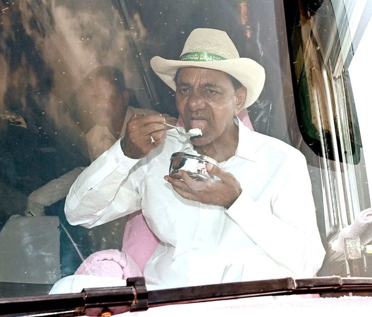 తెలంగాణ ముఖ్యమంత్రి కేసీఆర్ రాష్ట్రంలోని పలు జిల్లాల్లో అకాల వర్షాలతో దెబ్బతిన్న పంటలను ఈరోజు పరిశీలించారు. ఈ క్రమంలోనే ఆసక్తికర సంఘటన చోటుచేసుకుంది. బిజీ షెడ్యూల్ కారణంగా సీఎం కేసీఆర్ బస్సులోనే మధ్యాహ్న భోజనం చేశారు.