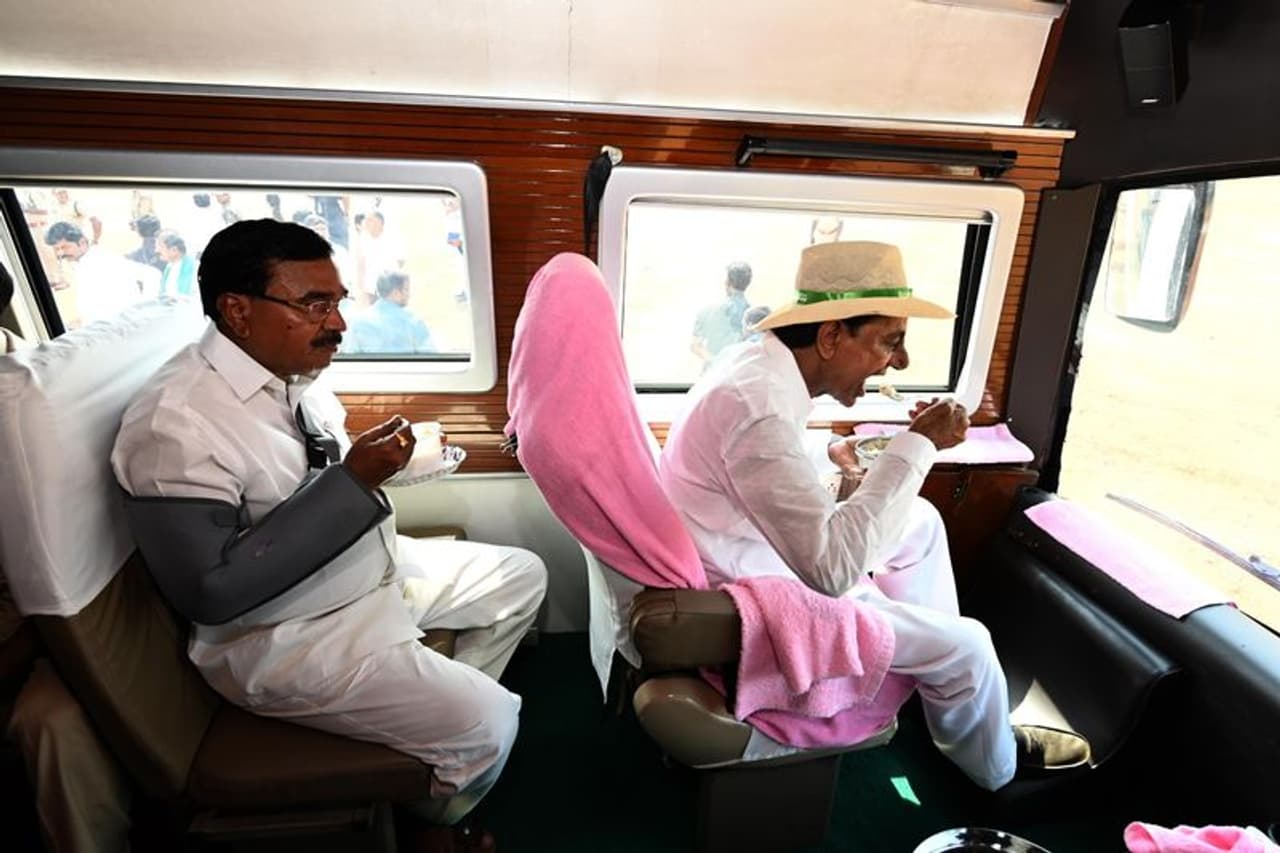 సీఎం కేసీఆర్తో పాటు బస్సులోని మంత్రులకు మంత్రి ఎర్రబెల్లి దయాకరరావు కొసరి కొసరి వడ్డించారు. మంత్రి ఎర్రబెల్లి.. మంత్రులతో పాటు సీఎస్ శాంతి కుమారి, సీఎంవో అధికారి సబర్వాల్కు పులిహోరను వడ్డించిన దృశ్యాలు సోషల్ మీడియాలో వైరల్గా మారాయి. సీఎం కేసీఆర్.. ముందు సీట్లో కూర్చొని పులిహోర, పెరగన్నం, అరటి పండు తిన్నారు.