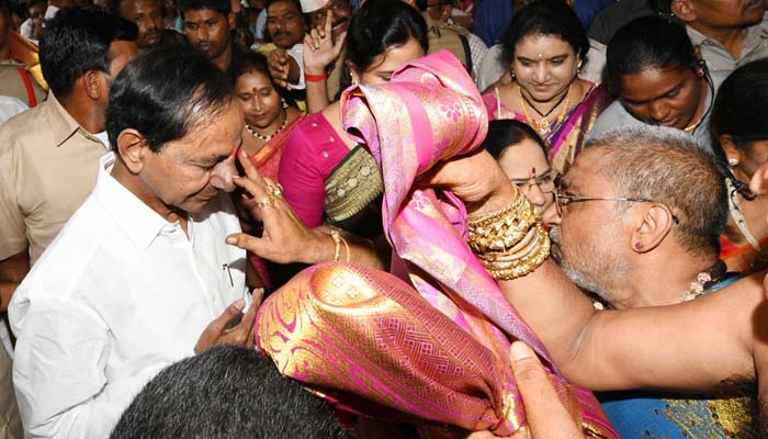 ముఖ్యమంత్రికి తెలంగాణ దేవాదాయ శాఖ మంత్రి ఇంద్రకరణ్ రెడ్డి, తెలంగాణ సినిమాటోగ్రఫీ శాఖ మంత్రి తలసాని శ్రీనివాస్ యాదవ్ లు స్వాగతం పలికారు. మంత్రులు, దేవాదాయశాఖాధికారులు దగ్గరుండి సీఎంను ఆలయంలోకి తీసుకెళ్లారు.