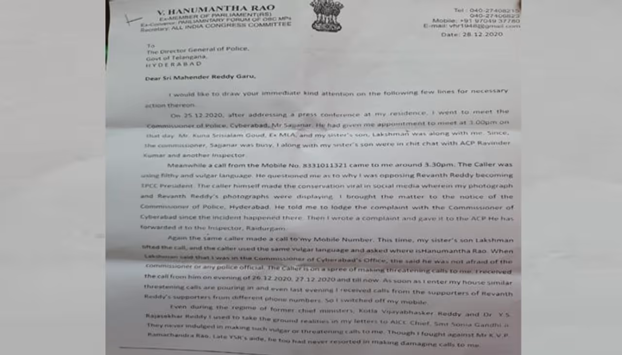 రేవంత్ అనుచరుల నుండి తనకు రక్షణ కల్పించాలంటూ వీహెచ్ డిజిపి మహేందర్ రెడ్డికి లేఖ రాశారు.