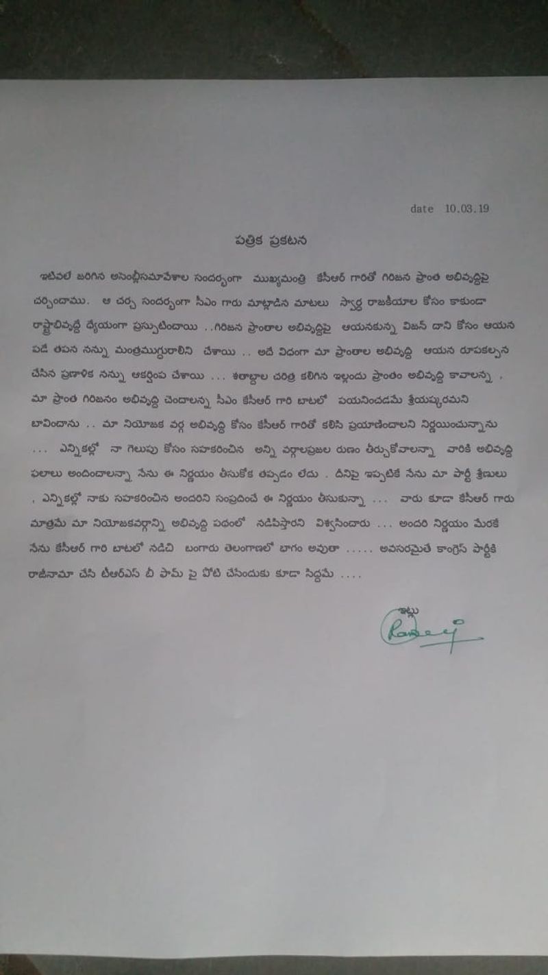 ఎన్నికల్లో తనకు సహకరించిన వారందరితో సంప్రదించిన తర్వాతే తాను ఈ నిర్ణయం తీసుకొన్నట్టుగా ఆమె చెప్పారు.అవసరమైతే కాంగ్రెస్ పార్టీకి రాజీనామా చేసి, టీఆర్ఎస్ బీ ఫారంపై పోటీ చేసేందుకు కూడ సిద్దమేనని హరిప్రియానాయక్ ప్రకటించారు.