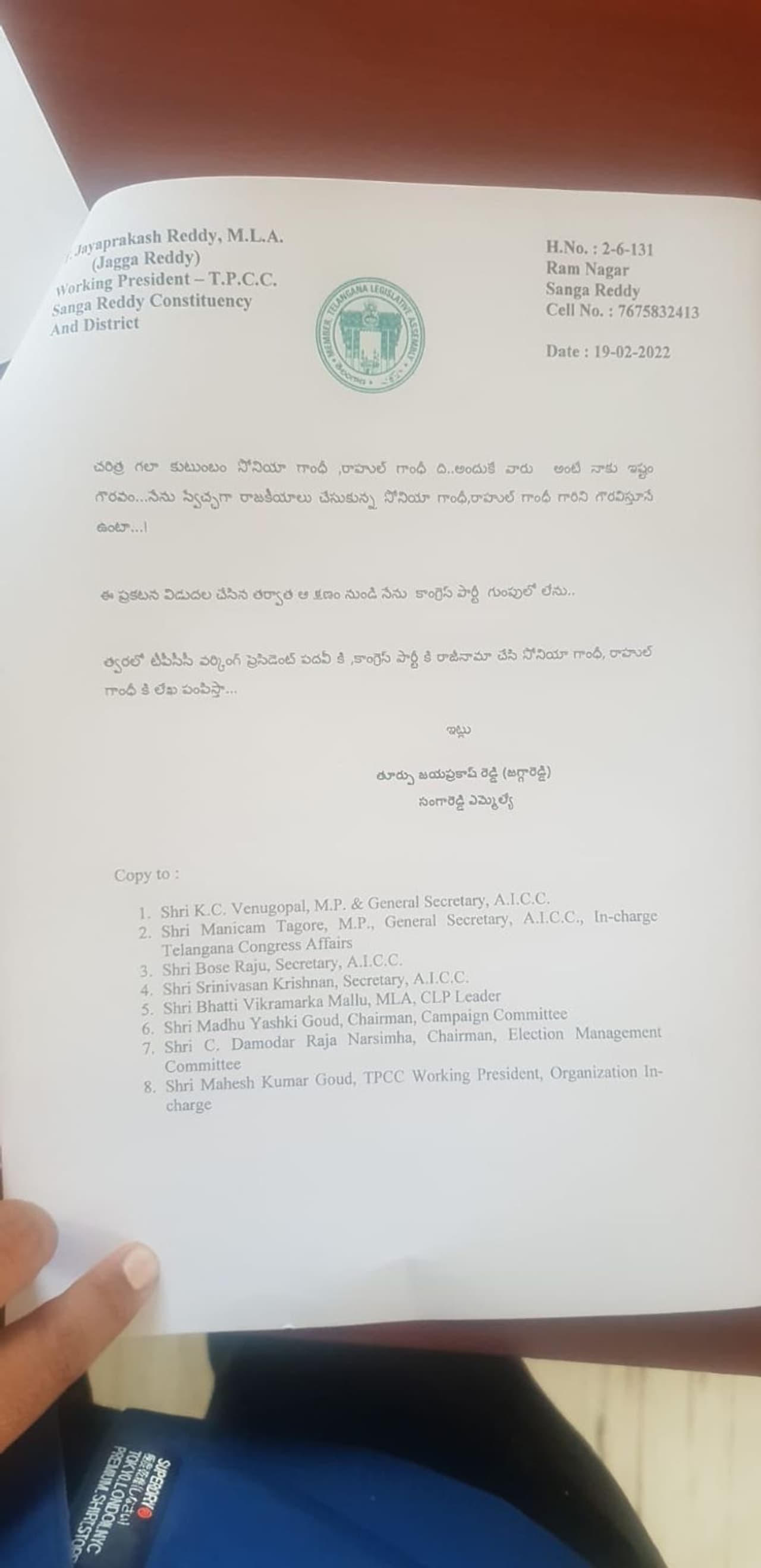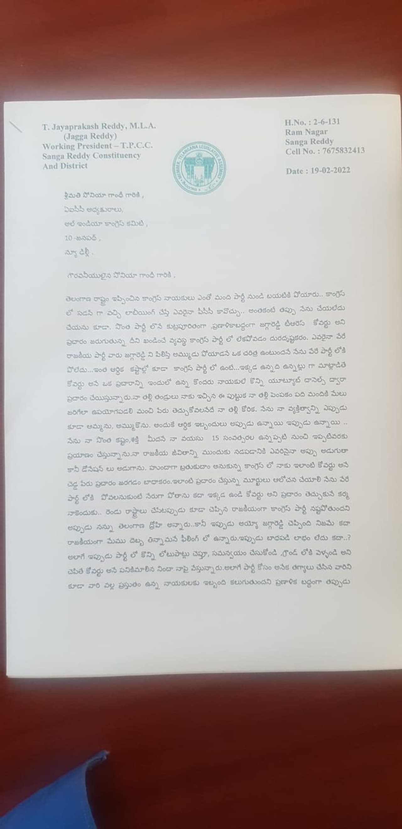 కాంగ్రెస్ అధినేత్రి సోనియా గాంధీ (sonia gandhi) , ఎంపీ రాహుల్ గాంధీలకు (raghul gandhi) టీపీసీసీ (tpcc) వర్కింగ్ ప్రెసిడెంట్, సంగారెడ్డి ఎమ్మెల్యే జగ్గారెడ్డి లేఖ (jagga reddy) రాశారు. త్వరలో టీపీసీసీ వర్కింగ్ ప్రెసిడెంట్ పదవికి, కాంగ్రెస్ పార్టీకి రాజీనామా చేస్తానని లేఖలో జగ్గారెడ్డి స్పష్టం చేశారు.