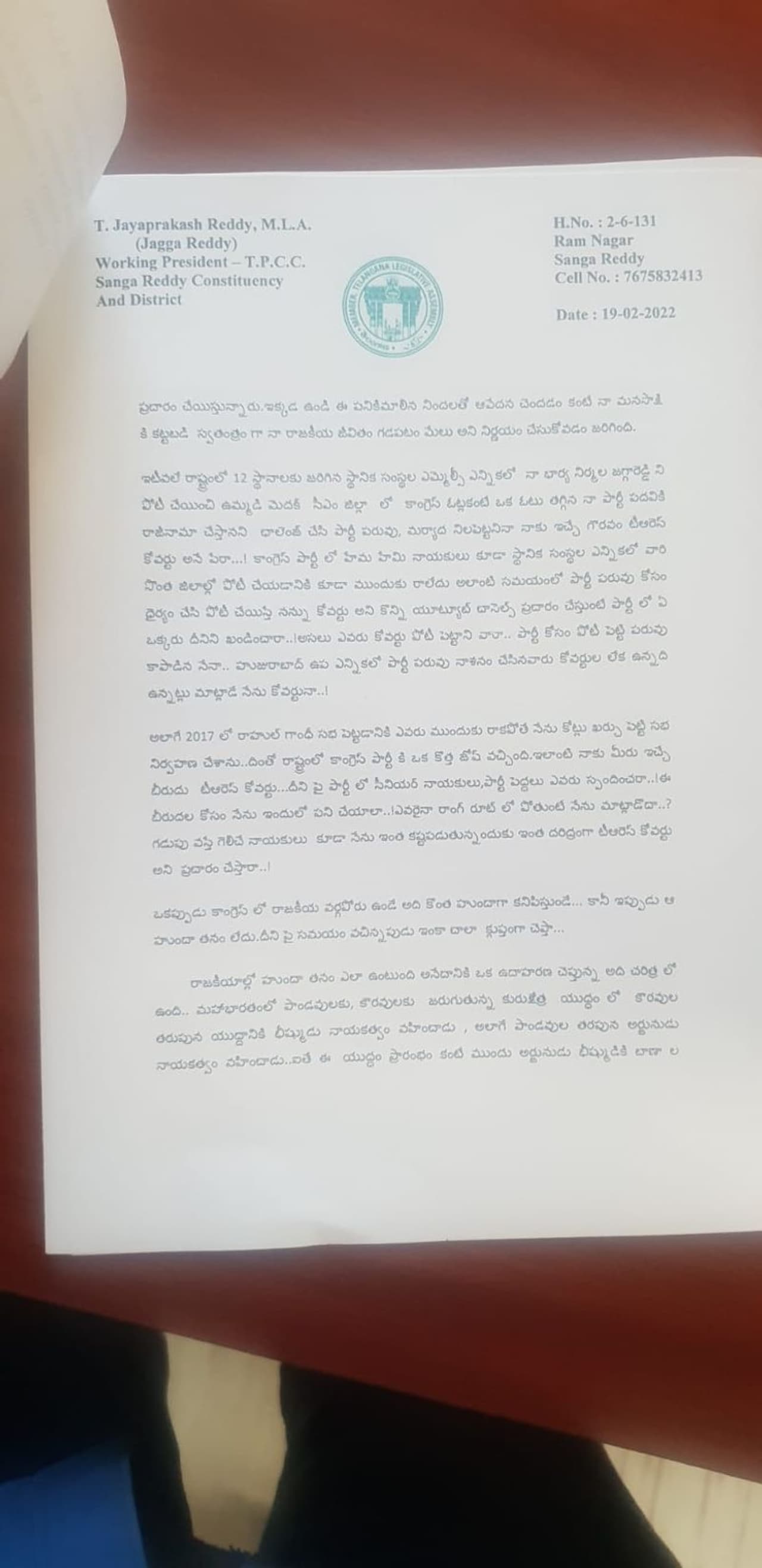 కాంగ్రెస్ అధినేత్రి సోనియా గాంధీ (sonia gandhi) , ఎంపీ రాహుల్ గాంధీలకు (raghul gandhi) టీపీసీసీ (tpcc) వర్కింగ్ ప్రెసిడెంట్, సంగారెడ్డి ఎమ్మెల్యే జగ్గారెడ్డి లేఖ (jagga reddy) రాశారు. ఈ లేఖ రాసిన క్షణం నుంచి తాను కాంగ్రెస్లో లేనట్లేనని అన్నారు. సడెన్గా వచ్చి లాబీయింగ్ చేస్తే ఎవరైనా పీసీసీ కావొచ్చని జగ్గారెడ్డి పేర్కొన్నారు. తనపై కోవర్ట్ అనే నిందలు వేస్తున్నారని ఆయన ఆవేదన వ్యక్తం చేశారు. గతంలోనూ కాంగ్రెస్లో వర్గ పోరు వుండేదని జగ్గారెడ్డి గుర్తుచేశారు. త్వరలో టీపీసీసీ వర్కింగ్ ప్రెసిడెంట్ పదవికి, కాంగ్రెస్ పార్టీకి రాజీనామా చేస్తానని లేఖలో జగ్గారెడ్డి స్పష్టం చేశారు.
