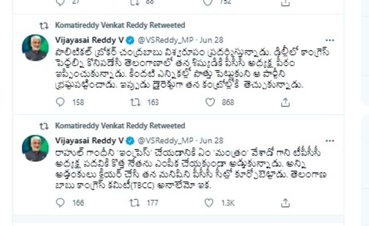 రాహుల్ గాంధీని ‘ఇంప్రెస్’ చేయడానికి ఏం ‘మంత్రం’ వేశాడో గాని టీపీసీసీ అధ్యక్ష పదవికి కొత్త నేతను ఎంపిక చేయకుండా అడ్డుకున్నాడు. అన్ని అడ్డంకులు క్లియర్ చేసి తన మనిషిని పీసీసీ సీట్లో కూర్చోబెట్టాడు. తెలంగాణ బాబు కాంగ్రెస్ కమిటీ(TBCC) అనాలేమో ఇక అంటూ విజయసాయిరెడ్డి ట్వీట్లు చేశారు. తాజాగా విజయసాయిరెడ్డి ట్వీట్ను కోమటిరెడ్డి వెంకట్ రెడ్డి రీట్వీట్ చేశారు. ఈ విషయం ఇప్పుడు రెండు రాష్ట్రాల్లోని పొలిటికల్ వర్గాల్లో హాట్ టాపిక్గా మారింది.