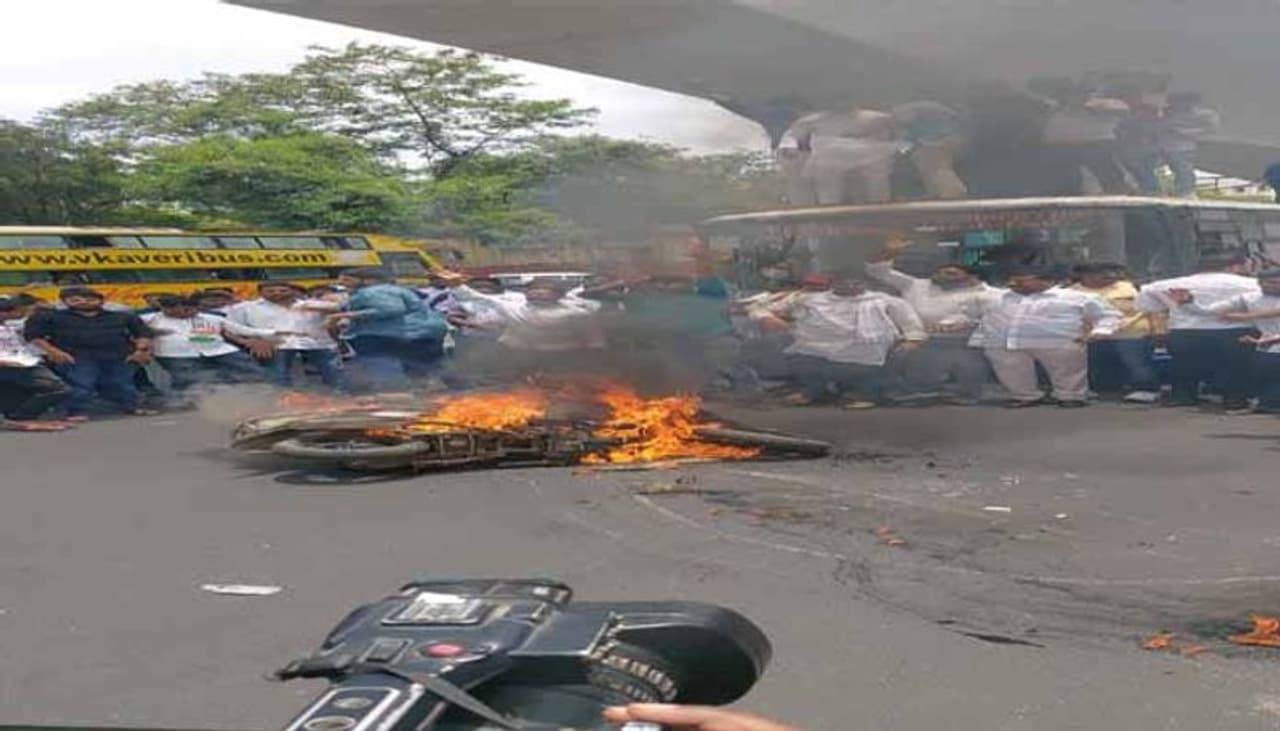 ఖైరతాబాద్ సెంటర్లో కాంగ్రెస్ పార్టీ కార్యకర్తలు బైక్ కు నిప్పు పెట్టి నిరసనకు దిగారు. మరో వైపు బస్సును రోడ్డుపై నిలిపివేసి బస్సుపైకి ఎక్కి ఆందోళన నిర్వహించారు. బస్సు అద్దాలను ధ్వంసం చేశారు. ఆందోళన చేస్తున్న కాంగ్రెస్ కార్యకర్తలను పోలీసులు అరెస్ట్ చేశారు. ఖైరతాబాద్ సెంటర్లో రోడ్డుపైనే కాంగ్రెస్ కార్యకర్తలు ఆందోళన చేయడంతో ట్రాఫిక్ రోడ్డుపైనే నిలిచిపోయింది. వాహనదారులు ఇబ్బంది పడ్డారు. కాంగ్రెస్ కార్యకర్తలు రాజ్ భవన్ వైపు వెళ్లకుండా ఖైరతాబాద్ సెంటర్ నుండి రాజ్ భవన్ సెంటర్ వైపునకు వెళ్లకుండా పోలీసులు బారికేడ్లను ఏర్పాటు చేశారు.