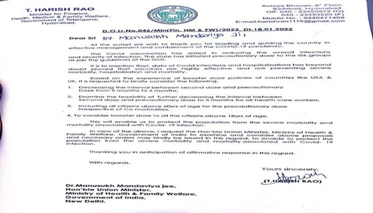 ఇక 60ఏళ్లు దాటిన ప్రతి ఒక్కరికీ (కోమార్బిడిటీస్ తో సంబంధం లేకుండా) ప్రికాషనరి డోసు ఇవ్వాలని సూచించారు. 18 ఏళ్లు దాటిన ప్రతి పౌరునికి బూస్టర్ డోసు ఇచ్చే విషయాన్ని పరిగణలోకి తీసుకోవాలన్నారు. అమెరికా, బ్రిటన్ వంటి దేశాల్లో అమలు చేస్తున్న బూస్టర్ డోస్ పాలసీలు, వాటి ఫలితాల ఆధారంగా పై ప్రతిపాదనలు మీ ముందు ఉంచుతున్నామని... వీటిని పరిగణనలోకి తీసుకోవాలని కేంద్ర మంత్రికి రాసిన లేఖలో పేర్కొన్నారు హరీష్ రావు.
