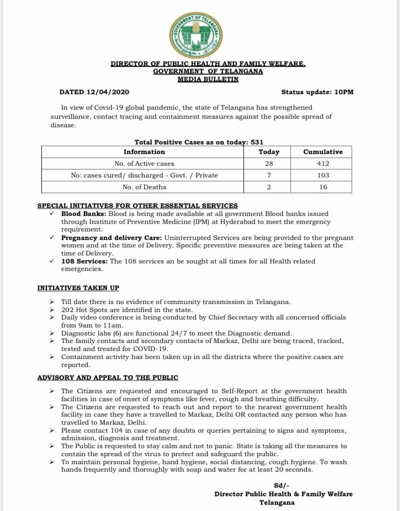 ఇకపోతే, తెలంగాణలో కరోనా వైరస్ కారణంగా తాజాగా ఇద్దరు మరణించారు. ఈ ఇద్దరితో కలుపుకొని ఇప్పటివరకు మొత్తం 16 మంది మరణించినట్టు అయింది. మరణాలు ఇలా ఉండగా, మరోవైపు తెలంగాణలో కరోనా మహమ్మారి బారినుంచి కోలుకొని బయటపడుతున్నవారి సంఖ్య కూడా ఆశాజనకంగా ఉంది. ఏడుగురికి నిన్న కరోనా నెగటివ్ రిజల్ట్స్ రావడంతో వారు పూర్తిగా కోలుకున్నారు అని ధృవీకరించుకున్న తరువాత డిశ్చార్జ్ చేసినట్టు తెలంగాణ ప్రభుత్వం ప్రకటించింది.