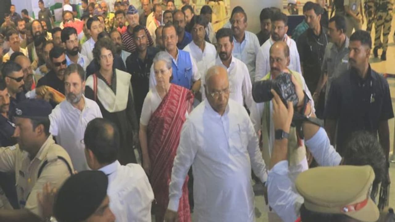 సీడబ్ల్యూసీ సమావేశాలకు హాజరయ్యేందుకు కాంగ్రెస్ అగ్రనేతలు హైదరాబాద్కు చేరుకున్నారు. వారికి శంషాబాద్ ఎయిర్పోర్టులో కాంగ్రెస్ శ్రేణులు ఘన స్వాగతం పలికాయి.