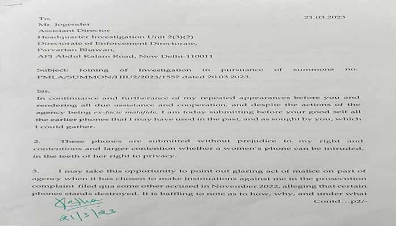 తాను ఫోన్లను ధ్వంసం చేశానని తప్పుడు ప్రచారం చేశారని కవిత ఆ లేఖలో పేర్కొన్నారు. ఏ ఉద్దేశ్యంతో ఇలా చేశారని కవిత ప్రశ్నించారు. మహిళ ఫోన్లను స్వాధీనం చేసుకోవడం స్వేచ్ఛకు భంగం కల్గించడమేనని ఆమె ఆ లేఖలో పేర్కొన్నారు. ఫోన్ల విషయంలో కనీసం సమన్లు కూడా ఇవ్వలేదని కవిత గుర్తు చేశారు.