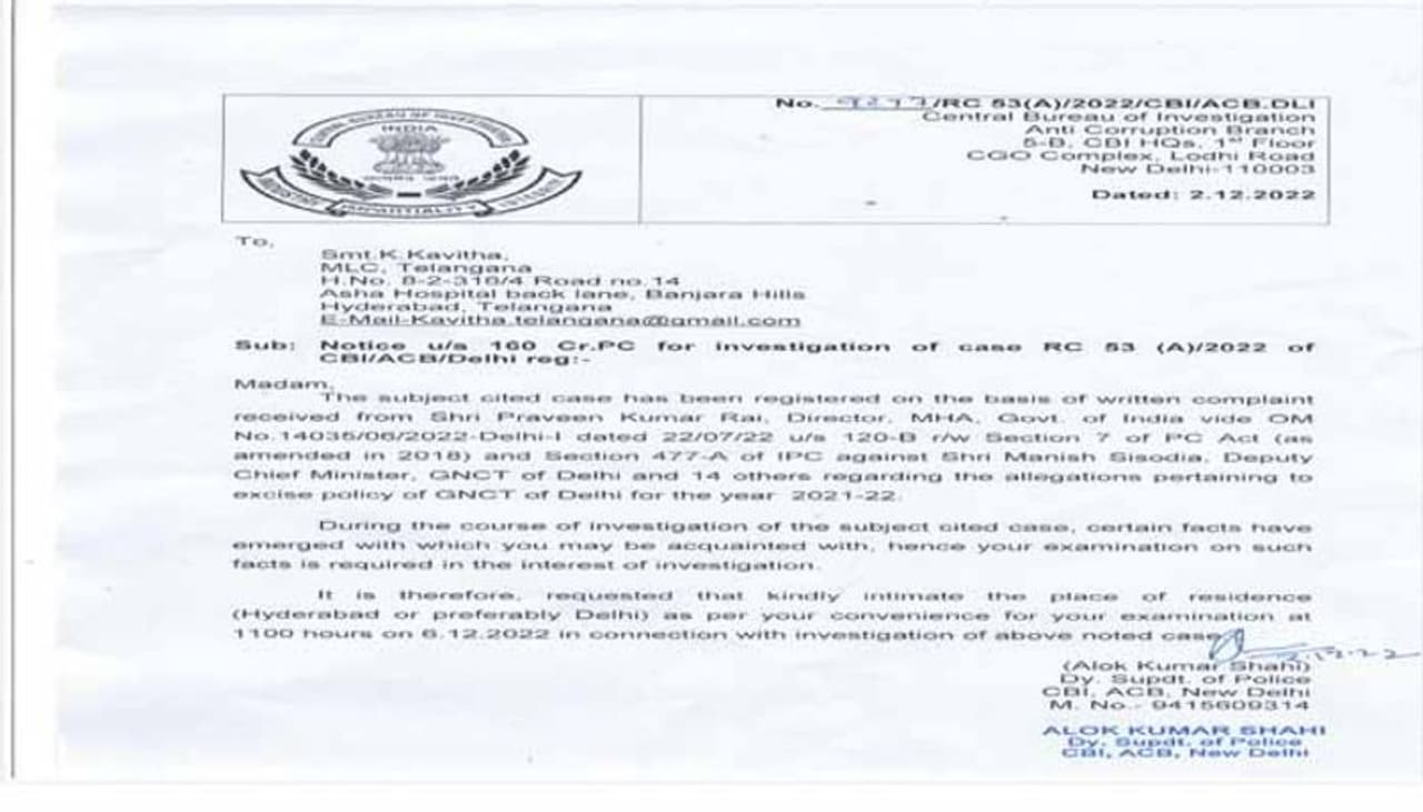 ఈ కేసులో ఇటీవలనే అరెస్టైన ఢిల్లీ డిప్యూటీ సీఎం మనీష్ సిసోడియా సన్నిహితుడు అమిత్ ఆరోరాను ఈడీ అధికారులు అరెస్ట్ చేశారు. అమిత్ ఆరోరా రిమాండ్ రిపోర్టులో ఎమ్మెల్సీ కవిత పేరును ప్రస్తావించారు. ఈ తరుణంలోనే ఎమ్మెల్సీ కవితకు సీబీఐ నోటీసులు జారీ చేయడం చర్చకు దారి తీసింది. సీబీఐ నోటీసులపై కవిత స్పందించారు. ఈ నెల 6వ తేదీన తన ఇంటి వద్దే సీబీఐకి వివరణ ఇవ్వనున్నట్టుగా కవిత తేల్చి చెప్పారు. తన ఇంటి వద్దే సీబీఐ అధికారులను కలుస్తానని సీబీఐ అధికారులకు సమాచారం ఇచ్చారు. ఈ నెల 6వ తేదీన ఢిల్లీ లేదా హైద్రాబాద్ లలో ఏదో ఒక చోట వివరణ ఇవ్వాలని సీబీఐ కోరింది. దీంతో కవిత హైద్రాబాద్ లో వివరణ ఇవ్వనున్నట్టుగా కవిత సీబీఐ అధికారులకు సమాచారం పంపింది.